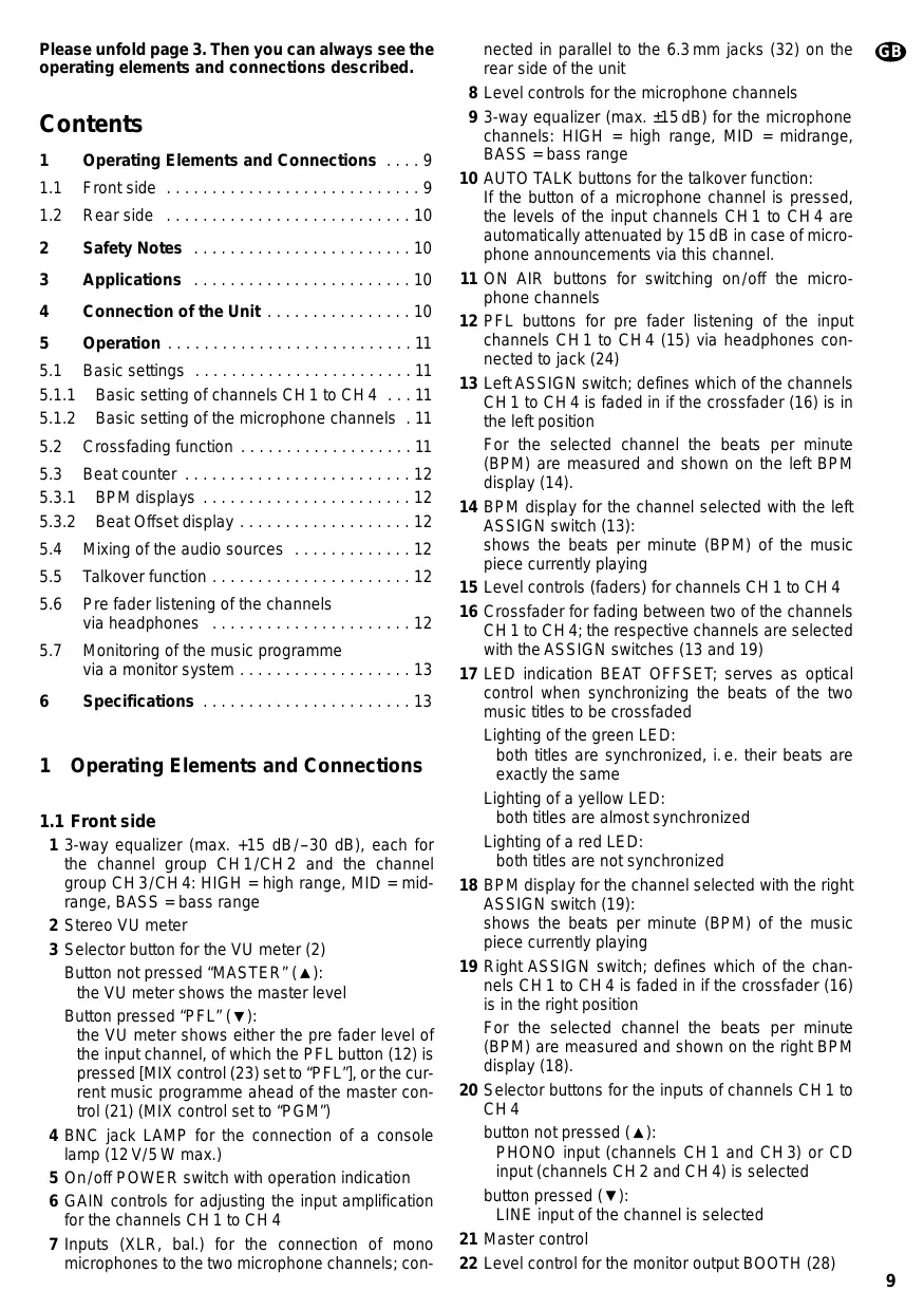 Please unfold page 3. Then you can always see the operating elements and connections described.