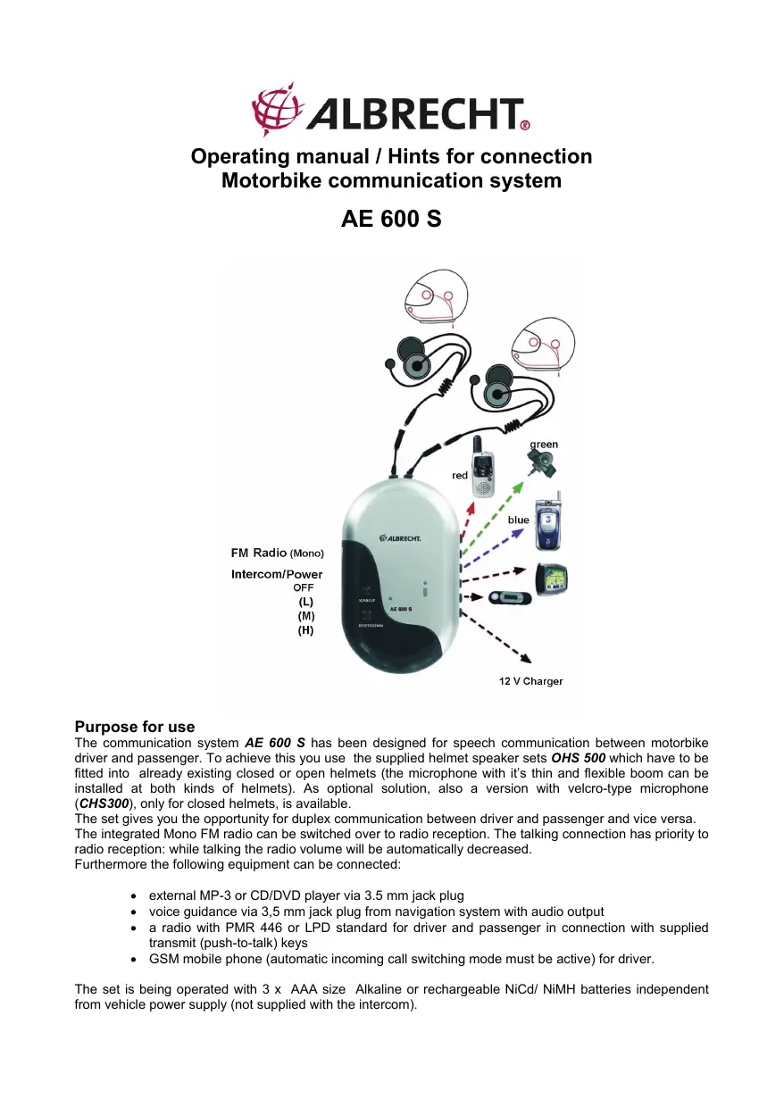 Hints for installation and connection Fitting of helmet sets: The two helmet sets consist of two flat padded ear sets to be inserted in the helmet, a microphone with a flexible thin boom to be installed close to your mouth and a waterproof transmit talk button which can be fixed within reach of the handle-bar or at your glove. Supplied are two self-adhesive pads for fitting the earphones in the helmet and a velcro tape adjustable in length to install the talk button. These adhesive pads do have an adhesive surface on one side (remove protective foil), on the other side there is a velcro clasp so that ear sets can be easily installed or removed for adjustment or cleaning. Bikers with only limited space to install the talk button i. e. on a metal plate at the handle bars may remove the velcro tape and stick the talk button with adhesive pads directly to the desired location. Please fix the ear sets with still a small gap between the ears and the helmet. Your ears should not be completely covered by the ear set because then you might not be able to listen to the surrounding noise of traffic (due to Road Traffic Act you may not use headsets that completely cover your ears because you might overhear honking or other signals). Please do not carry out any technical modifications at the helmet before installing the headset. The ECE standard for motorbike helmets does not permit to flatten the material inside the helmet i. e. to make space for the ear set. Fix the microphone so, that it is always close to your mouth with the supplied adhesive pad. Before fixing the adhesive pads thoroughly clean the desired location (i.e. with alcohol, but do not use any solvent). Press tightly and remember that it takes several hours until the final strength has been achieved. You need the talk button only in case you want to operate an additional PMR radio or another Walkie Talkie. You do not need the talk button for the basic intercom function between driver and passenger or radio/MP3. As long as only Intercom is used, the cable sets plugs for PMR radio, the talk button and / or GSM phone cable do not need to be inserted. This makes basic installation very simple- just plug in the 2 headphones, and that’s it! Where to locate the central unit The best place for location of the central unit is inside or close to the tank knap sack or in the outside-pocket of your biker-suit. The headset cable leading to the driver simultaneously serve as the radio antenna (use the spiralled cable only for pillion) . Lead the driver headset cable along your back under the biker-suit to get best results of the FM radio. Installing the radio and/or mobile phone Radio and mobile phone do only achieve their maximum radiation if installed detached from surroundings. If being used at the same time both should be as far apart as possible from each other and from the central unit. Temporary storage in your pockets does reduce range. Never place radio, mobile phone and /or central unit in the same pocket, undesired interferences, especially from GSM while transmission may occur. If you do not use a radio or mobile phone You simply unplug the cable sets and leave them at home! The connections to the helmet sets (black) are waterproof. Connect the plugs with the markings facing each other. The other supplied cable sets have colour rings as marking, while the sockets at the central unit have the same colour markings, so you can easily find the correct sockets. Power supply / Inserting of batteries Open the battery lid at the bottom of the central unit. Insert 3 batteries or rechargeable batteries size AAA (Micro). Pay attention to the correct position of the battery poles. It is possible to recharge rechargeable batteries form the electrical power (10,8V – 15,6V) of your motor cycle (10). Use only charging cable of ALBRECHT; it is especially designed to limit the charging-current. Do not try to recharge normal batteries instead accumulations. Do not use the AE 600 S powered from your motor cycle (10,8V – 15,6V) without any rechargeable batteries, because the DC In socket is only designed as charging socket.