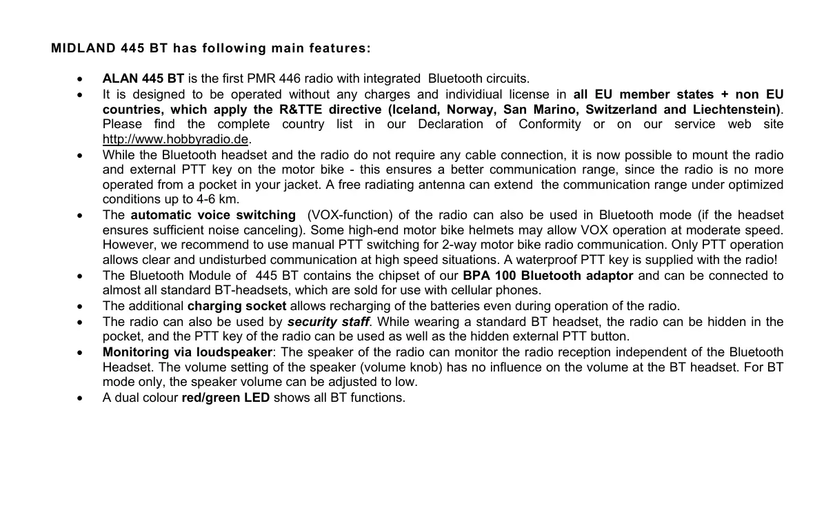 MIDLAND 445 BT has following main features: + ALAN 445 BTis the first PMR 446 radio with integrated Bluetooth circuits. + lt is designed to be operated without any charges and individiual license in all EU member states + non EU countries, which apply the R&TTE directive (Iceland, Norway, San Marino, Switzerland and Liechtenstein). Please find the complete country list in our Declaration of Conformity or on our service web site http://www.hobbvradio.de. + __ While the Bluetooth headset and the radio do not require any cable connection, it is now possible to mount the radio and external PTT key on the motor bike - this ensures a better communication range, since the radio is no more operated from a pocket in your jacket. A free radiating antenna can extend the communication range under optimized conditions up to 4-6 km. + The automatic voice switching (VOX-function) of the radio can also be used in Bluetooth mode (if the headset ensures sufficient noise canceling). Some high-end motor bike helmets may allow VOX operation at moderate speed. However, we recommend to use manual PTT switching for 2-way motor bike radio communication. Only PTT operation allows clear and undisturbed communication at high speed situations. À waterproof PTT key is supplied with the radio! + The Bluetooth Module of 445 BT contains the chipset of our BPA 100 Bluetooth adaptor and can be connected to almost all standard BT-headsets, which are sold for use with cellular phones. + __ The additional charging socket allows recharging of the batteries even during operation of the radio. + The radio can also be used by security staff. While wearing a standard BT headset, the radio can be hidden in the pocket, and the PTT key of the radio can be used as well as the hidden external PTT button. + Monitoring via loudspeaker: The speaker of the radio can monitor the radio reception independent of the Bluetooth Headset. The volume setting of the speaker (volume knob) has no influence on the volume at the BT headset. For BT mode only, the speaker volume can be adjusted to low. + A dual colour red/green LED shows all BT functions.