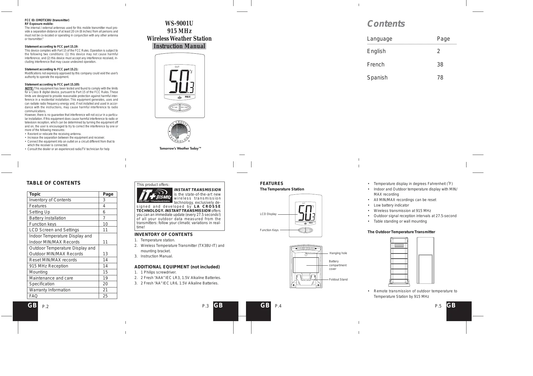 P.4 Remote transmission of outdoor temperature to Temperature Station by 915 MHz P.5
