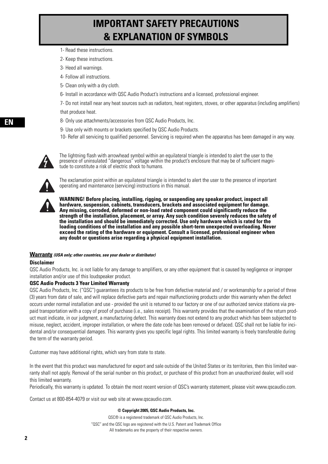 Disclaimer QSC Audio Products, Inc. is not liable for any damage to amplifiers, or any other equipment that is caused by negligence or improper installation and/or use of this loudspeaker product. QSC Audio Products 3 Year Limited Warranty QSC Audio Products, Inc. (“QSC”) guarantees its products to be free from defective material and / or workmanship for a period of three (3) years from date of sale, and will replace defective parts and repair malfunctioning products under this warranty when the defect occurs under normal installation and use - provided the unit is returned to our factory or one of our authorized service stations via prepaid transportation with a copy of proof of purchase (i.e., sales receipt). This warranty provides that the examination of the return product must indicate, in our judgment, a manufacturing defect. This warranty does not extend to any product which has been subjected to misuse, neglect, accident, improper installation, or where the date code has been removed or defaced. QSC shall not be liable for incidental and/or consequential damages. This warranty gives you specific legal rights. This limited warranty is freely transferable during the term of the warranty period. Customer may have additional rights, which vary from state to state. In the event that this product was manufactured for export and sale outside of the United States or its territories, then this limited warranty shall not apply. Removal of the serial number on this product, or purchase of this product from an unauthorized dealer, will void this limited warranty. Periodically, this warranty is updated. To obtain the most recent version of QSC’s warranty statement, please visit www.qscaudio.com. Contact us at 800-854-4079 or visit our web site at www.qscaudio.com. © Copyright 2005, QSC Audio Products, Inc. QSC® is a registered trademark of QSC Audio Products, Inc. “QSC” and the QSC logo are registered with the U.S. Patent and Trademark Office All trademarks are the property of their respective owners.