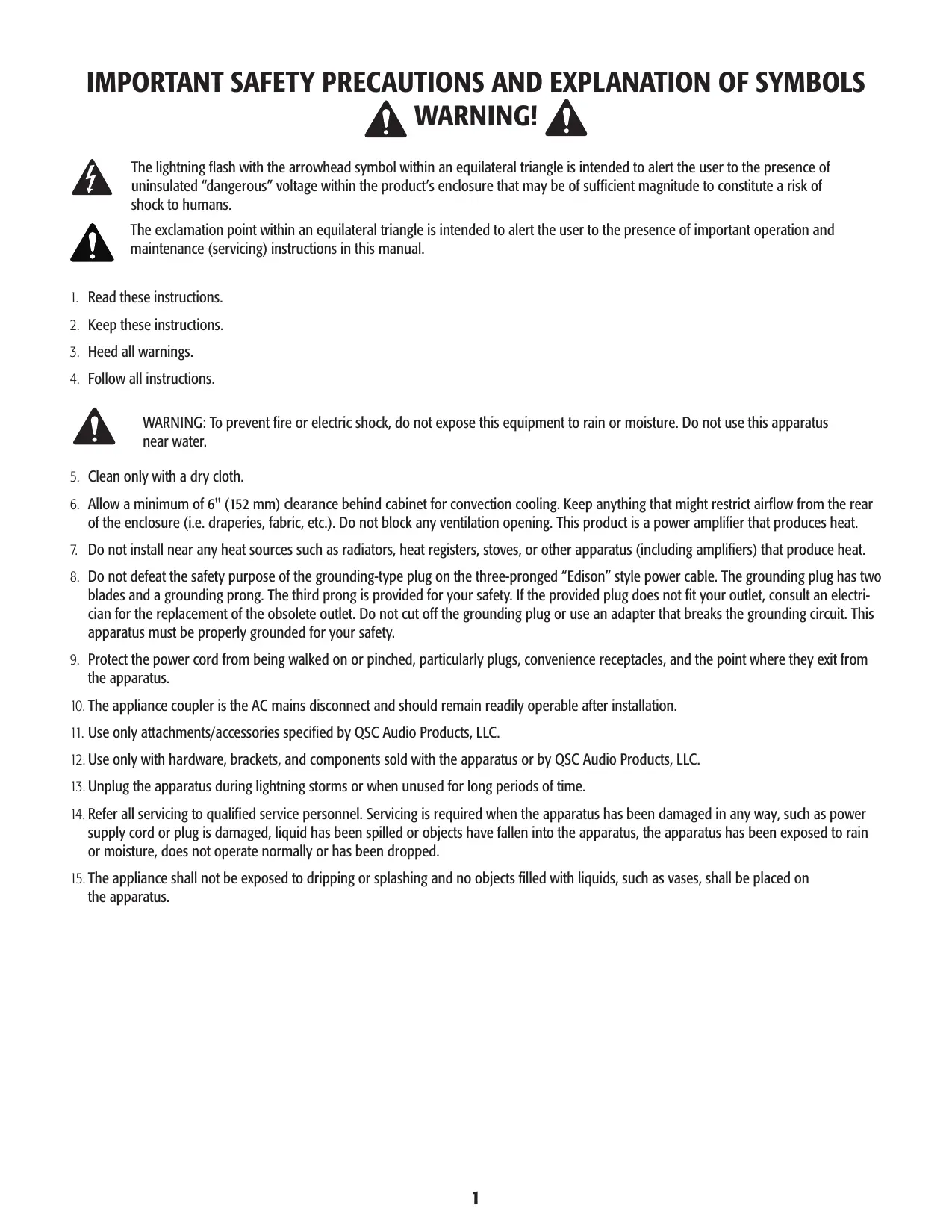 1. Lire ces instructions. 2. Conserver ces instructions. 3. Respecter tous les avertissements. 4. Suivre toutes les instructions. AVERTISSEMENT : Pour écarter les risques d'incendie et d'électrocution, ne pas exposer ce matériel à la pluie ou l'humidité. Ne pas utiliser cet appareil près de l'eau. 5. Nettoyer uniquement avec un chiffon sec. 6. Prévoir un dégagement minimum de 152 mm à l'arrière de l'enceinte pour un refroidissement par convection. Tout ce qui risquerait de réduire la circulation d'air doit être tenu à l'écart de l'arrière de l'enceinte (rideaux, tissu, etc.). Ne pas bloquer les bouches d'aération. Ce produit est un amplificateur de puissance qui dégage de la chaleur. 7. N'installer à proximité d'aucune source de chaleur comme des radiateurs, des registres de chaleur, des poêles ou d'autres appareils (y compris des amplis) qui dégagent de la chaleur. 8. Ne pas éliminer la sécurité de la fiche de terre du câble d'alimentation de style Edison à 3 broches. Une fiche de terre a deux broches et une broche de terre. La troisième broche assure la sécurité. Si la fiche fournie n'entre pas dans la prise, consulter un électricien pour faire remplacer la prise obsolète. Ne pas couper la fiche de terre et ne pas utiliser d'adaptateur qui rompe le circuit de mise à la terre. Par mesure de sécurité, cet appareil doit être correctement mis à la terre. 9. Protéger le cordon d'alimentation pour que personne ne puisse marcher dessus, qu'il ne puisse pas être pincé, surtout les fiches, les prises de courant d'entretien et le point d'émergence du cordon de l'appareil. 10. Le coupleur de l'appareil est l'interrupteur général et il doit être immédiatement utilisable après l'installation. 11. Utiliser uniquement les accessoires spécifiés par QSC Audio Products, LLC. 12. Utiliser uniquement avec la visserie, les supports, socles et composants vendus avec l'appareil ou par QSC Audio Products, LLC. 13. Débrancher l'appareil en cas d'orage électrique ou lorsqu'il est inutilisé pendant longtemps. 14. Confier toutes les réparations à un personnel qualifié. Une réparation s'impose lorsque l'appareil a été endommagé d'une manière quelconque, par exemple endommagement du cordon d'alimentation ou de sa fiche, déversement de liquide ou chute d'objets sur ou à l'intérieur de l'appareil, exposition de l'appareil à la pluie ou l'humidité, fonctionnement anormal ou chute de l'appareil. 15. L'appareil ne doit pas être exposé à des gouttes ou des projections et aucun objet rempli de liquide (vase, par ex.) ne doit être posé dessus.