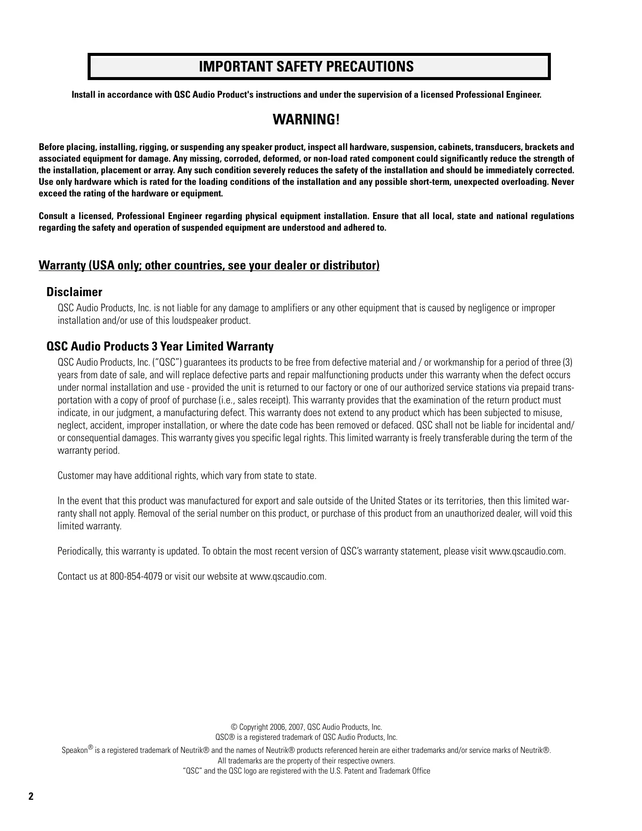 © Copyright 2006, 2007, ASC Audio Products, Inc. QSCO is a registered trademark of QSC Audio Products, Inc. Speakon° is a registered trademark of Neutrik® and the names of Neutrik® products referenced herein are either trademarks and/or service marks of Neutrik® All trademarks are the property of their respective owners. “SC” and the QSC logo are registered with the U.S. Patent and Trademark Office