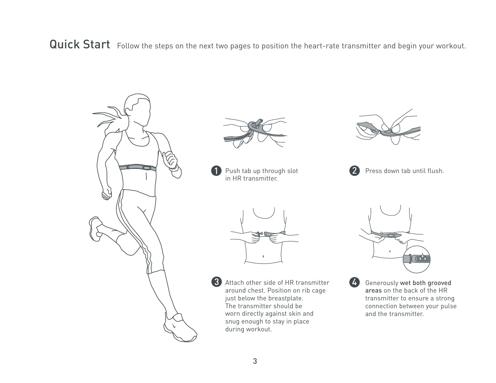 Quick Start Follow the steps on the next two pages to position the heart-rate transmitter and begin your workout. Push tab up through slot [2] Press down tab until flush. in HR transmitter.