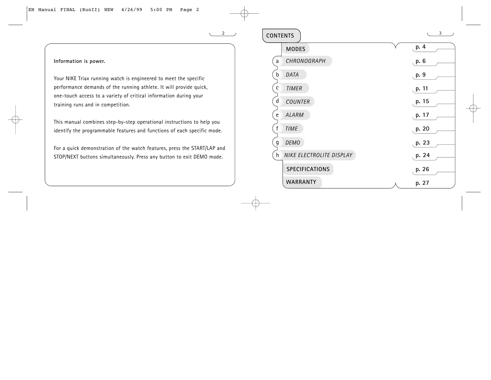EN Manual FINAL (RunIl) NEW 4/26/99 5:00 PM Page 2 CONTENTS 3 MODES P4 Information is power. a CHRONOGRAPH p6 | Your NIKE Triax running watch is engineered to meet the specific D) PA: PI performance demands of the running athlete. lt will provide quick, © TIMER p.11 OT | one-touch access to a variety of critical information during your 3 training runs and in competition. COUNTER p.15, | e ALARM æ17, This manual combines step-by-step operational instructions to help you identify the programmable features and functions of each specific mode. f TIME p.20 , 9 DEMO . 23 For a quick demonstration of the watch features, press the START/LAP and ES STOP/NEXT buttons simultaneously. Press any button to exit DEMO mode. h_ NIKE ELECTROLITE DISPLAY «p-24 | SPECIFICATIONS p. 26 LT | WARRANTY p. 27