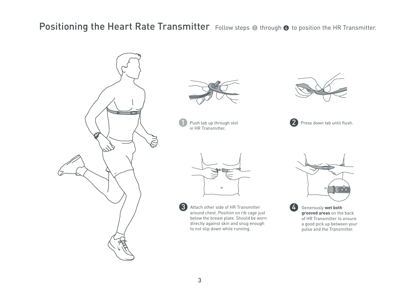Push tab up through slot in HR Transmitter. (3) Attach other side of HR Transmitter around chest. Position on rib cage just below the breast plate. Should be worn directly against skin and snug enough to not slip down while running. Positioning the Heart Rate Transmitter Follow steps @ through @ to position the HR Transmitter.