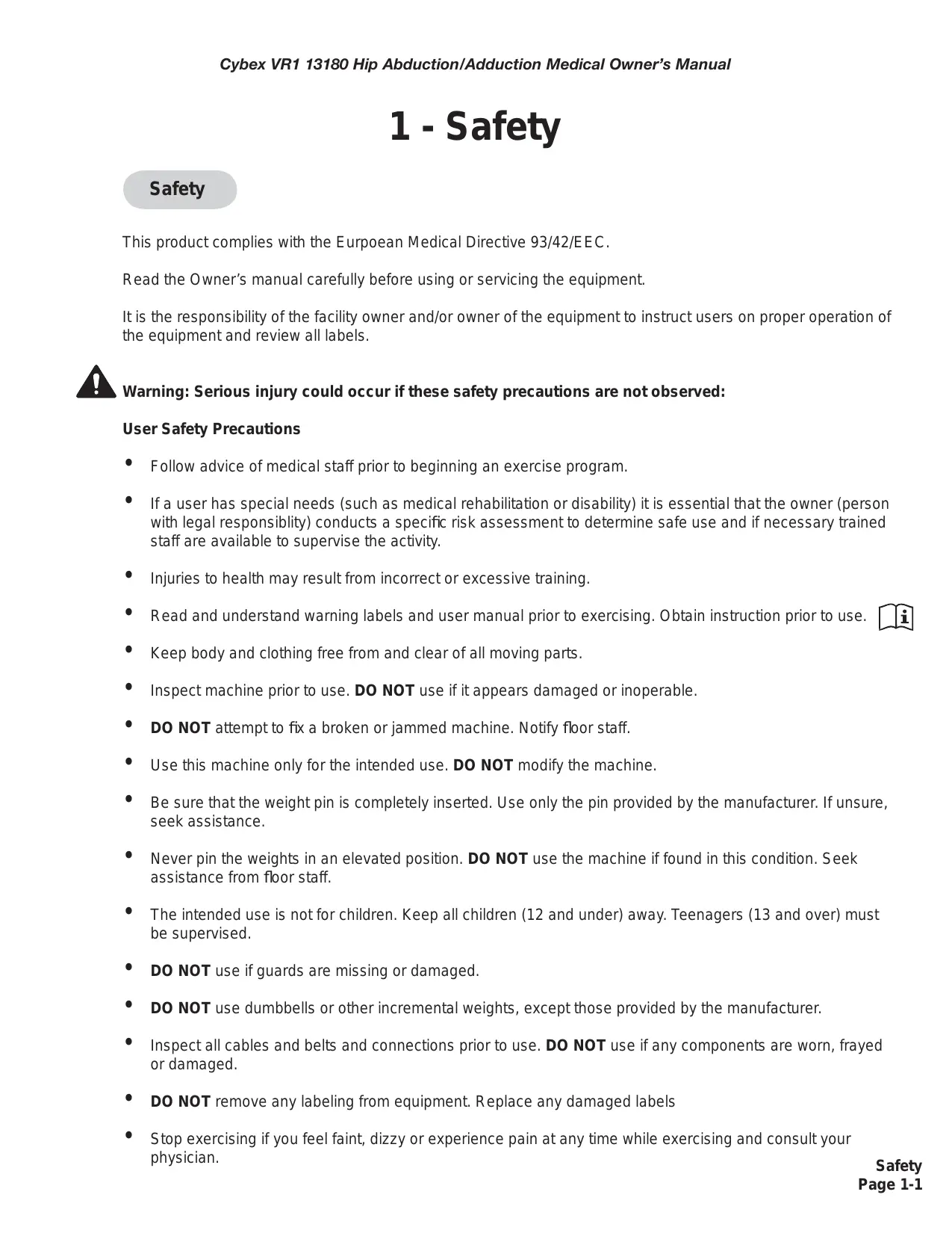 It is the responsibility of the purchaser/user of Cybex products to read and understand the owner's manual, and warning labels; as well as instruct all individuals, whether end users or supervising personnel, on proper usage of the equipment.