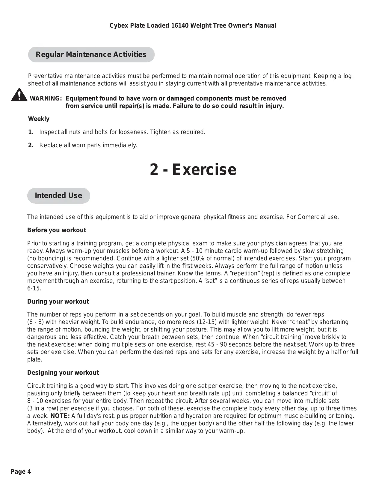 NOTE: Cybex is not responsible for performing regular inspection and maintenance actions for your machines. Instruct all personnel in equipment inspection and maintenance actions and also in accident reporting/recording. Cybex phone representatives are available to answer any questions or concerns that you may have.