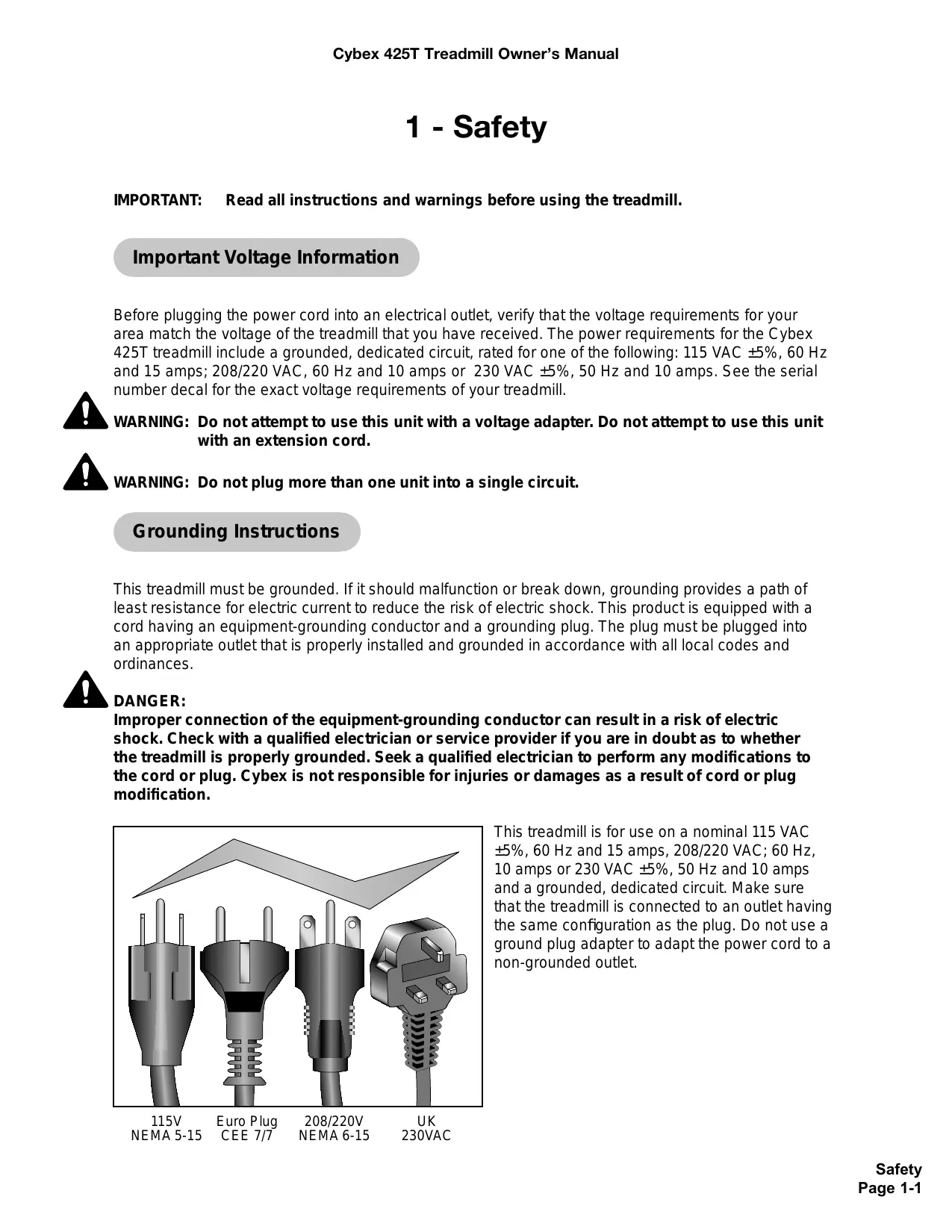 Improper connection of the equipment-grounding conductor can result in a risk of electric shock. Check with a qualified electrician or service provider if you are in doubt as to whether the treadmill is properly grounded. Seek a qualified electrician to perform any modifications to the cord or plug. Cybex is not responsible for injuries or damages as a result of cord or plug modification.