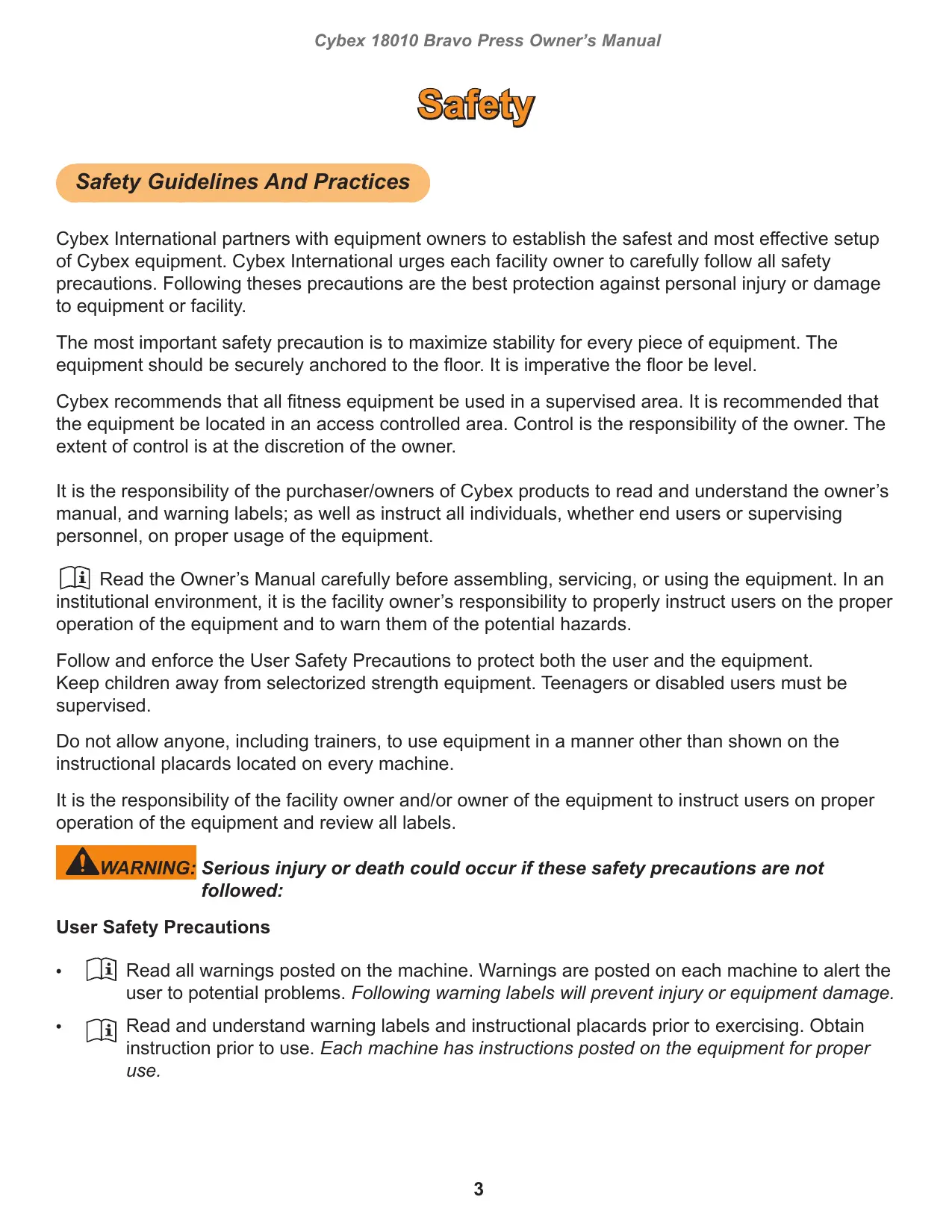 It is the responsibility of the purchaser/owners of Cybex products to read and understand the owner's manual, and warning labels; as well as instruct all individuals, whether end users or supervising personnel, on proper usage of the equipment.