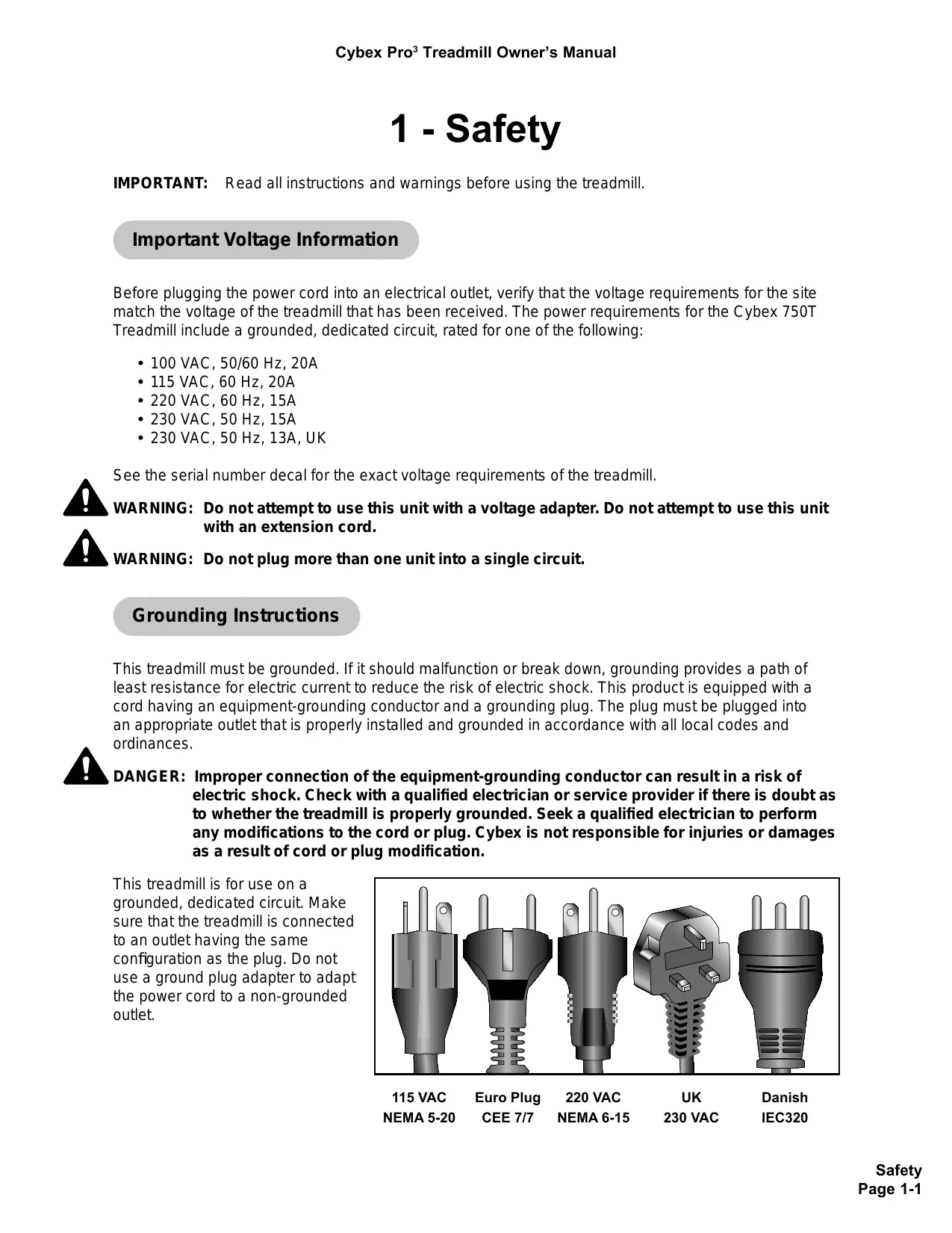 DANGER: Improper connection of the equipment-grounding conductor can result in a risk of electric shock. Check with a qualified electrician or service provider if there is doubt as to whether the treadmill is properly grounded. Seek a qualified electrician to perform any modifications to the cord or plug. Cybex is not responsible for injuries or damages as a result of cord or plug modification.