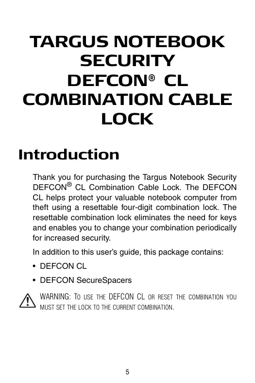 TARGUS NOTEBOOK SECURITY DEFCON® CL COMBINATION CABLE LOCK Introduction Thank you for purchasing the Targus Notebook Security DEFCON® CL Combination Cable Lock. The DEFCON CL helps protect your valuable notebook computer from theft using a resettable four-digit combination lock. The resettable combination lock eliminates the need for keys and enables you to change your combination periodically for increased security. In addition to this user’s guide, this package contains: • DEFCON CL • DEFCON SecureSpacers