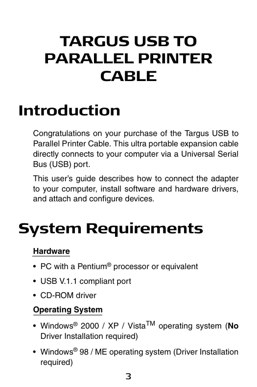 Congratulations on your purchase of the Targus USB to Parallel Printer Cable. This ultra portable expansion cable directly connects to your computer via a Universal Serial Bus (USB) port. This user’s guide describes how to connect the adapter to your computer, install software and hardware drivers, and attach and configure devices.
