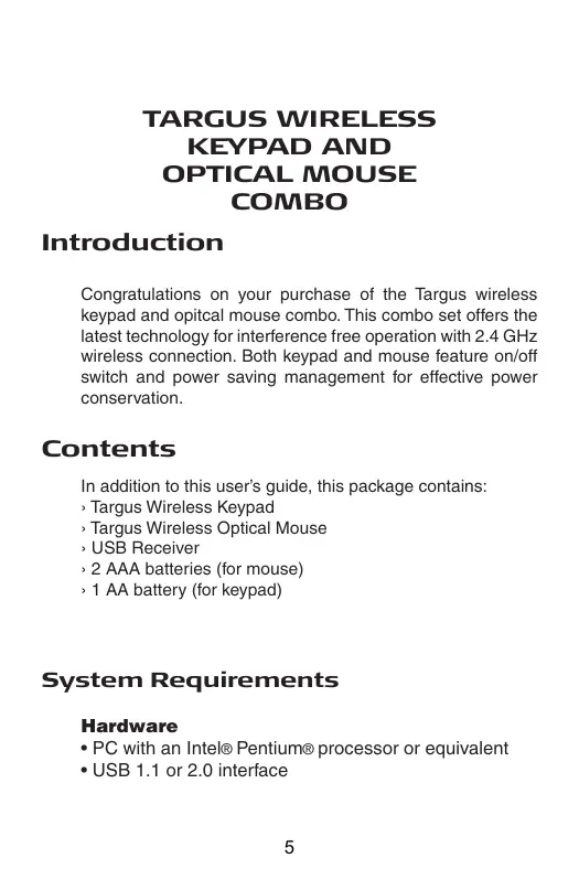 Download the instructions for your Accessoires informatiques in PDF format for free! Find your manual WIRELESS KEYPAD AND OPTICAL MOUSE COMBO - TARGUS and take your electronic device back in hand. On this page are published all the documents necessary for the use of your device. WIRELESS KEYPAD AND OPTICAL MOUSE COMBO by TARGUS.