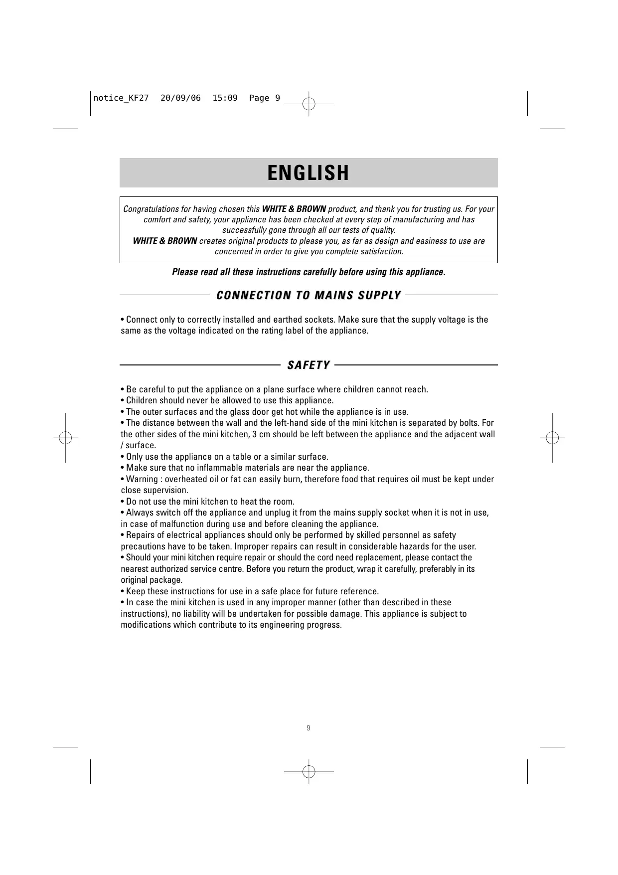 Congratulations for having chosen this WHITE & BROWN product, and thank you for trusting us. For your comfort and safety, your appliance has been checked at every step of manufacturing and has successfully gone through all our tests of quality.