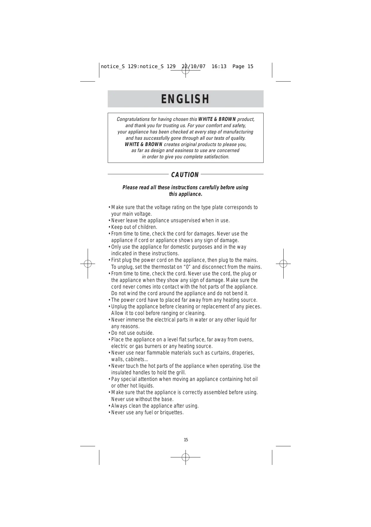 Congratulations for having chosen this WHITE & BROWN product, and thank you for trusting us. For your comfort and safety, your appliance has been checked at every step of manufacturing and has successfully gone through all our tests of quality. WHITE & BROWN creates original products to please you, as far as design and easiness to use are concerned in order to give you complete satisfaction.