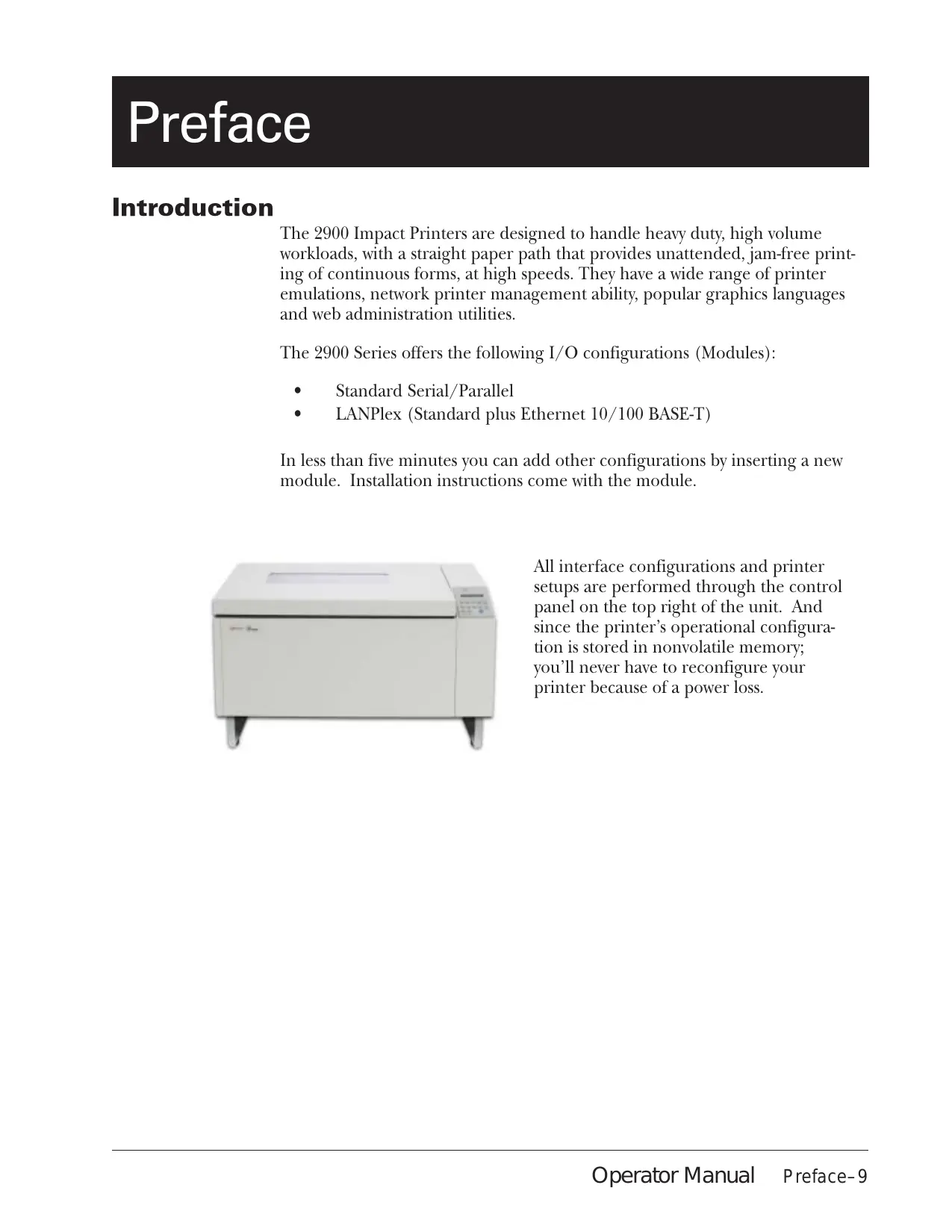 Preface Introduction The 2900 Impact Printers are designed to handle heavy duty, high volume workloads, with a straight paper path that provides unattended, jam-free print- ing of continuous forms, at high speeds. They have a wide range of printer emulations, network printer management ability, popular graphics languages and web administration utilities. The 2900 Series offers the following 1/0 configurations (Modules): Q Standard Serial/Parallel . LANPlex (Standard plus Ethernet 10/100 BASE-T) In less than five minutes you can add other configurations by inserting a new module. Installation instructions come with the module. All interface configurations and printer setups are performed through the control panel on the top right of the unit. And — since the printer’s operational configura- tion is stored in nonvolatile memory; you’Il never have to reconfigure your printer because of a power loss. Operator Manual Preface-9