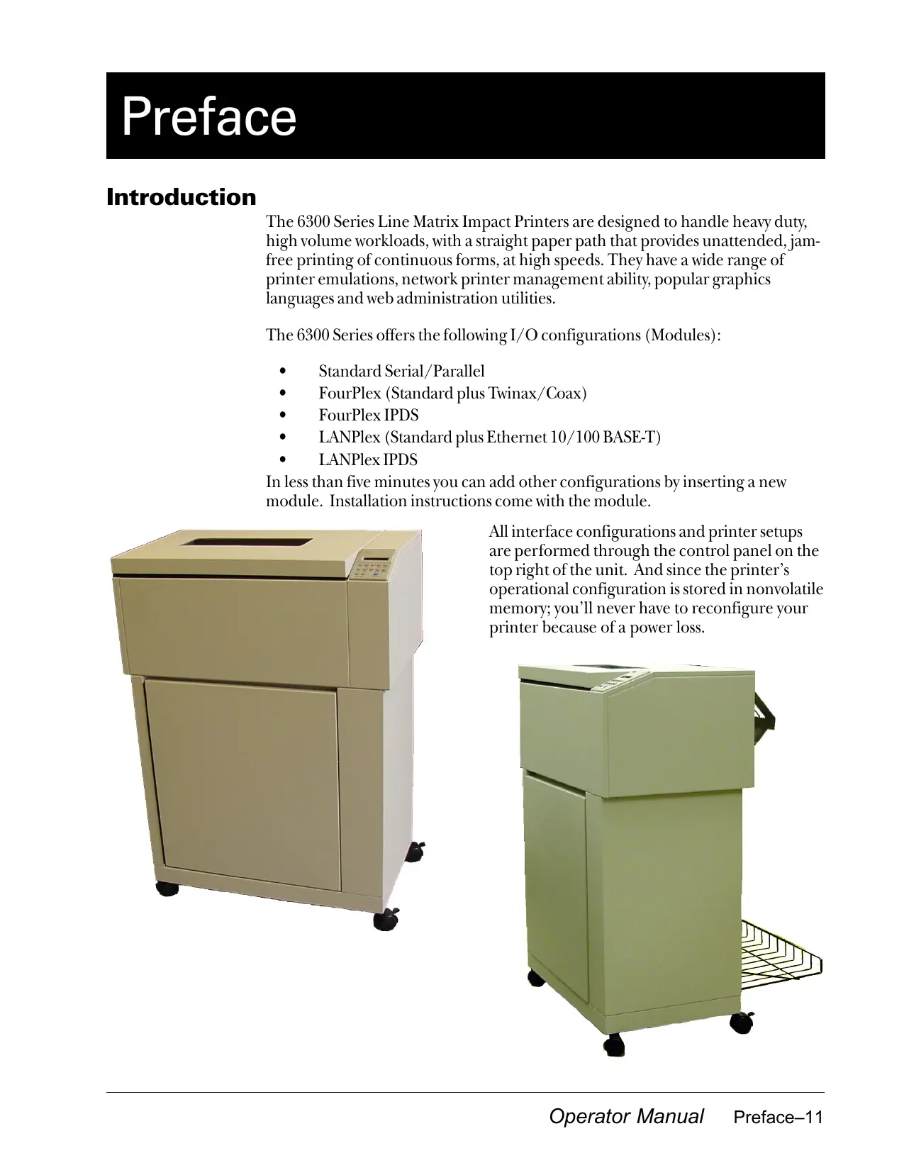 Preface Introduction The 6300 Series Line Matrix Impact Printers are designed to handle heavy duty, high volume workloads, with a straight paper path that provides unattended, jam- free printing of continuous forms, at high speeds. They have a wide range of printer emulations, network printer management ability, popular graphics languages and web administration utilities. The 6300 Series offers the following 1/0 configurations (Modules): Q Standard Serial/Parallel . FourPlex (Standard plus Twinax/Coax) . FourPlex IPDS . LANPlex (Standard plus Ethernet 10/100 BASE-T) + LANPlexIPDS In less than five minutes you can add other configurations by inserting a new module. Installation instructions come with the module. Allinterface configurations and printer setups are performed through the control panel on the top right ofthe unit. And since the printer’s operational configuration is stored in nonvolatile memory; you’Il never have to reconfigure your printer because of a power loss. Operator Manual Preface-11
