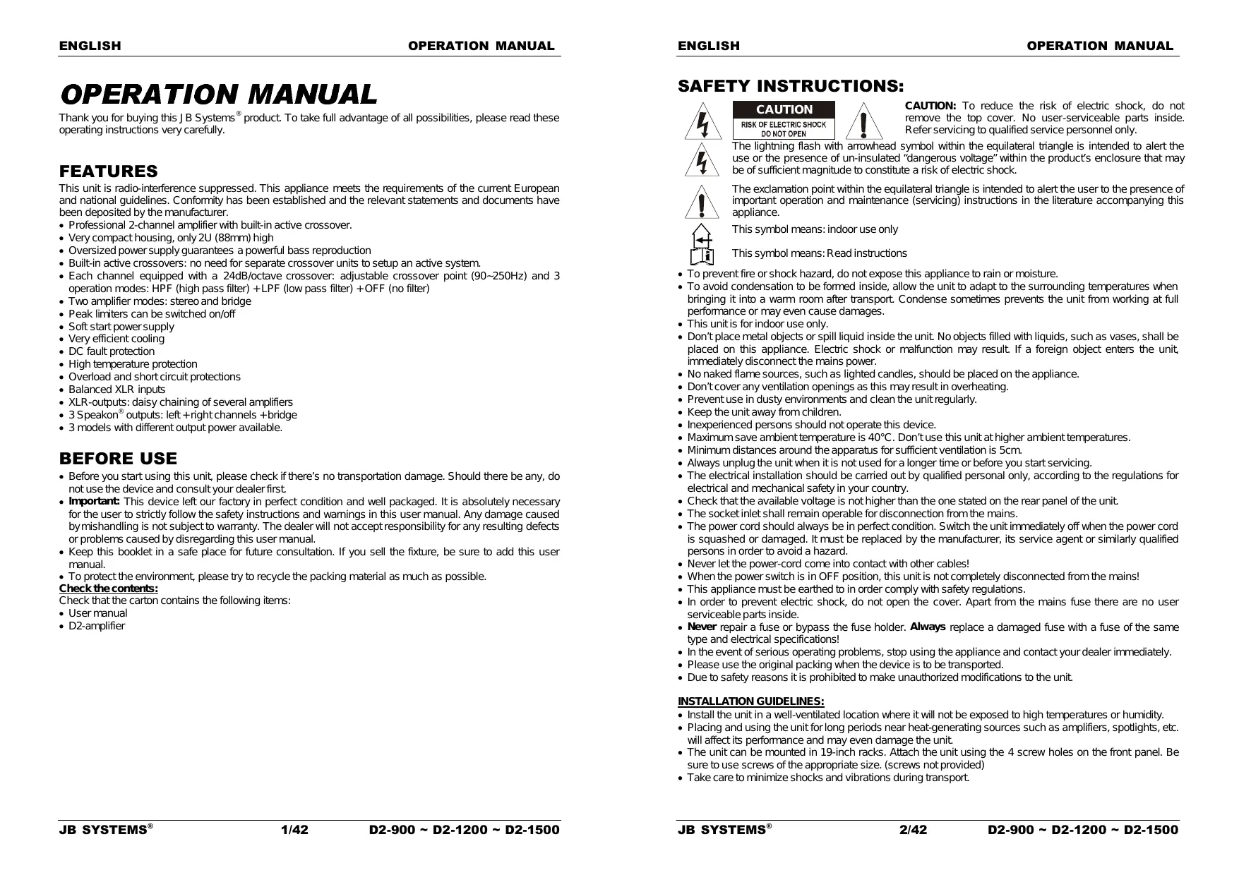 Thank you for buying this JB Systems product. To take full advantage of all possibilities, please read these operating instructions very carefully. CAUTION CAUTION: To reduce the risk of electric shock, do not remove the top cover. No user-serviceable parts inside. Refer servicing to qualified service personnel only. The lightning flash with arrowhead symbol within the equilateral triangle is intended to alert the use or the presence of un-insulated “dangerous voltage” within the product’s enclosure that may be of sufficient magnitude to constitute a risk of electric shock. FEATURES This unit is radio-interference suppressed. This appliance meets the requirements of the current European and national guidelines. Conformity has been established and the relevant statements and documents have been deposited by the manufacturer. Professional 2-channel amplifier with built-in active crossover. Very compact housing, only 2U (88mm) high Oversized power supply guarantees a powerful bass reproduction Built-in active crossovers: no need for separate crossover units to setup an active system. Each channel equipped with a 24dB/octave crossover: adjustable crossover point (90~250Hz) and 3 operation modes: HPF (high pass filter) + LPF (low pass filter) + OFF (no filter) Two amplifier modes: stereo and bridge Peak limiters can be switched on/off Soft start power supply Very efficient cooling DC fault protection High temperature protection Overload and short circuit protections Balanced XLR inputs XLR-outputs: daisy chaining of several amplifiers 3 Speakon outputs: left + right channels + bridge 3 models with different output power available. BEFORE USE Before you start using this unit, please check if there’s no transportation damage. Should there be any, do not use the device and consult your dealer first. Important: This device left our factory in perfect condition and well packaged. It is absolutely necessary for the user to strictly follow the safety instructions and warnings in this user manual. Any damage caused by mishandling is not subject to warranty. The dealer will not accept responsibility for any resulting defects or problems caused by disregarding this user manual. Keep this booklet in a safe place for future consultation. If you sell the fixture, be sure to add this user manual. To protect the environment, please try to recycle the packing material as much as possible. Check the contents: Check that the carton contains the following items: User manual D2-amplifier The exclamation point within the equilateral triangle is intended to alert the user to the presence of important operation and maintenance (servicing) instructions in the literature accompanying this appliance. This symbol means: indoor use only This symbol means: Read instructions To prevent fire or shock hazard, do not expose this appliance to rain or moisture. To avoid condensation to be formed inside, allow the unit to adapt to the surrounding temperatures when bringing it into a warm room after transport. Condense sometimes prevents the unit from working at full performance or may even cause damages. This unit is for indoor use only. Don’t place metal objects or spill liquid inside the unit. No objects filled with liquids, such as vases, shall be placed on this appliance. Electric shock or malfunction may result. If a foreign object enters the unit, immediately disconnect the mains power. No naked flame sources, such as lighted candles, should be placed on the appliance. Don’t cover any ventilation openings as this may result in overheating. Prevent use in dusty environments and clean the unit regularly. Keep the unit away from children. Inexperienced persons should not operate this device. Maximum save ambient temperature is 40°C. Don’t use this unit at higher ambient temperatures. Minimum distances around the apparatus for sufficient ventilation is 5cm. Always unplug the unit when it is not used for a longer time or before you start servicing. The electrical installation should be carried out by qualified personal only, according to the regulations for electrical and mechanical safety in your country. Check that the available voltage is not higher than the one stated on the rear panel of the unit. The socket inlet shall remain operable for disconnection from the mains. The power cord should always be in perfect condition. Switch the unit immediately off when the power cord is squashed or damaged. It must be replaced by the manufacturer, its service agent or similarly qualified persons in order to avoid a hazard. Never let the power-cord come into contact with other cables! When the power switch is in OFF position, this unit is not completely disconnected from the mains! This appliance must be earthed to in order comply with safety regulations. In order to prevent electric shock, do not open the cover. Apart from the mains fuse there are no user serviceable parts inside. Never repair a fuse or bypass the fuse holder. Always replace a damaged fuse with a fuse of the same type and electrical specifications! In the event of serious operating problems, stop using the appliance and contact your dealer immediately. Please use the original packing when the device is to be transported. Due to safety reasons it is prohibited to make unauthorized modifications to the unit. INSTALLATION GUIDELINES: Install the unit in a well-ventilated location where it will not be exposed to high temperatures or humidity. Placing and using the unit for long periods near heat-generating sources such as amplifiers, spotlights, etc. will affect its performance and may even damage the unit. The unit can be mounted in 19-inch racks. Attach the unit using the 4 screw holes on the front panel. Be sure to use screws of the appropriate size. (screws not provided) Take care to minimize shocks and vibrations during transport. JB SYSTEMS® 1/42 D2-900 ~ D2-1200 ~ D2-1500 JB SYSTEMS® 2/42 D2-900 ~ D2-1200 ~ D2-1500 ENGLISH OPERATION MANUAL When i