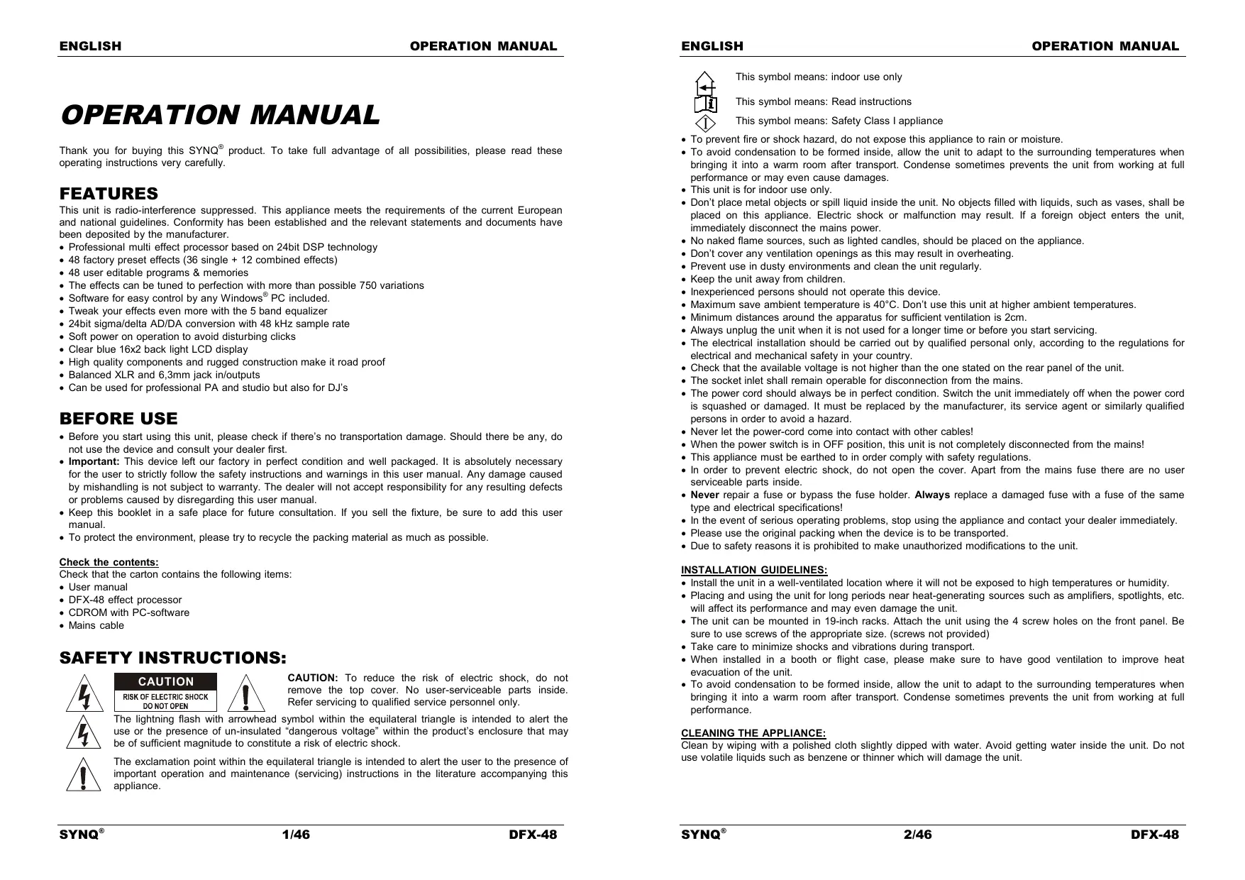 Thank you for buying this SYNQ product. To take full advantage of all possibilities, please read these operating instructions very carefully. FEATURES This unit is radio-interference suppressed. This appliance meets the requirements of the current European and national guidelines. Conformity has been established and the relevant statements and documents have been deposited by the manufacturer. Professional multi effect processor based on 24bit DSP technology 48 factory preset effects (36 single + 12 combined effects) 48 user editable programs & memories The effects can be tuned to perfection with more than possible 750 variations Software for easy control by any Windows PC included. Tweak your effects even more with the 5 band equalizer 24bit sigma/delta AD/DA conversion with 48 kHz sample rate Soft power on operation to avoid disturbing clicks Clear blue 16x2 back light LCD display High quality components and rugged construction make it road proof Balanced XLR and 6,3mm jack in/outputs Can be used for professional PA and studio but also for DJ’s BEFORE USE Before you start using this unit, please check if there’s no transportation damage. Should there be any, do not use the device and consult your dealer first. Important: This device left our factory in perfect condition and well packaged. It is absolutely necessary for the user to strictly follow the safety instructions and warnings in this user manual. Any damage caused by mishandling is not subject to warranty. The dealer will not accept responsibility for any resulting defects or problems caused by disregarding this user manual. Keep this booklet in a safe place for future consultation. If you sell the fixture, be sure to add this user manual. To protect the environment, please try to recycle the packing material as much as possible. Check the contents: Check that the carton contains the following items: User manual DFX-48 effect processor CDROM with PC-software Mains cable SAFETY INSTRUCTIONS: CAUTION CAUTION: To reduce the risk of electric shock, do not remove the top cover. No user-serviceable parts inside. Refer servicing to qualified service personnel only. The lightning flash with arrowhead symbol within the equilateral triangle is intended to alert the use or the presence of un-insulated “dangerous voltage” within the product’s enclosure that may be of sufficient magnitude to constitute a risk of electric shock. The exclamation point within the equilateral triangle is intended to alert the user to the presence of important operation and maintenance (servicing) instructions in the literature accompanying this appliance. SYNQ® 1/46 DFX-48 To prevent fire or shock hazard, do not expose this appliance to rain or moisture. To avoid condensation to be formed inside, allow the unit to adapt to the surrounding temperatures when bringing it into a warm room after transport. Condense sometimes prevents the unit from working at full performance or may even cause damages. This unit is for indoor use only. Don’t place metal objects or spill liquid inside the unit. No objects filled with liquids, such as vases, shall be placed on this appliance. Electric shock or malfunction may result. If a foreign object enters the unit, immediately disconnect the mains power. No naked flame sources, such as lighted candles, should be placed on the appliance. Don’t cover any ventilation openings as this may result in overheating. Prevent use in dusty environments and clean the unit regularly. Keep the unit away from children. Inexperienced persons should not operate this device. Maximum save ambient temperature is 40°C. Don’t use this unit at higher ambient temperatures. Minimum distances around the apparatus for sufficient ventilation is 2cm. Always unplug the unit when it is not used for a longer time or before you start servicing. The electrical installation should be carried out by qualified personal only, according to the regulations for electrical and mechanical safety in your country. Check that the available voltage is not higher than the one stated on the rear panel of the unit. The socket inlet shall remain operable for disconnection from the mains. The power cord should always be in perfect condition. Switch the unit immediately off when the power cord is squashed or damaged. It must be replaced by the manufacturer, its service agent or similarly qualified persons in order to avoid a hazard. Never let the power-cord come into contact with other cables! When the power switch is in OFF position, this unit is not completely disconnected from the mains! This appliance must be earthed to in order comply with safety regulations. In order to prevent electric shock, do not open the cover. Apart from the mains fuse there are no user serviceable parts inside. Never repair a fuse or bypass the fuse holder. Always replace a damaged fuse with a fuse of the same type and electrical specifications! In the event of serious operating problems, stop using the appliance and contact your dealer immediately. Please use the original packing when the device is to be transported. Due to safety reasons it is prohibited to make unauthorized modifications to the unit. INSTALLATION GUIDELINES: Install the unit in a well-ventilated location where it will not be exposed to high temperatures or humidity. Placing and using the unit for long periods near heat-generating sources such as amplifiers, spotlights, etc. will affect its performance and may even damage the unit. The unit can be mounted in 19-inch racks. Attach the unit using the 4 screw holes on the front panel. Be sure to use screws of the appropriate size. (screws not provided) Take care to minimize shocks and vibrations during transport. When installed in a booth or flight case, please make sure to have good ventilation to improve heat evacuation of the unit. To avoid condensation to be formed inside, allow the unit to adapt to the surrounding temperatures when bringing it into a warm room after 