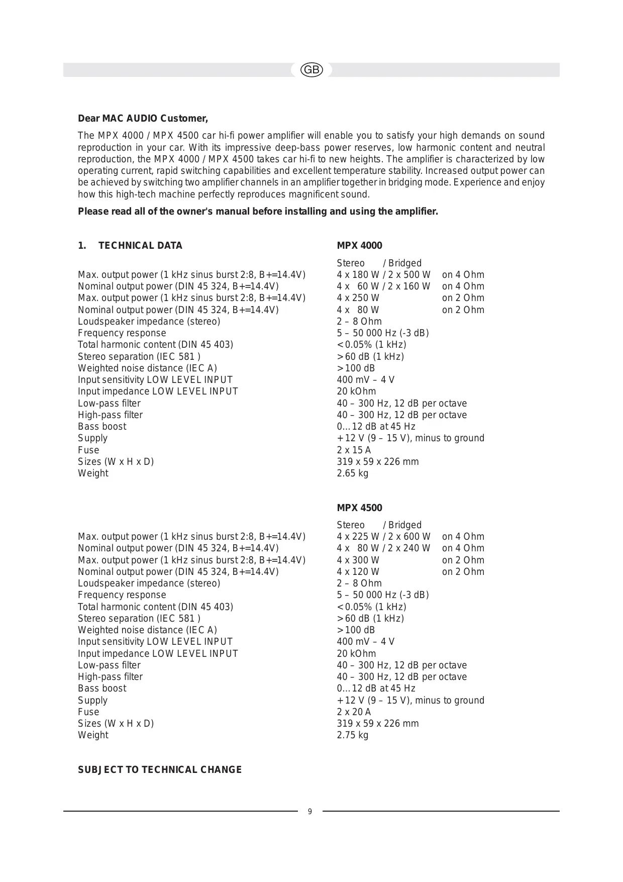 Dear MAC AUDIO Customer, The MPX 4000 / MPX 4500 car hi-fi power amplifier will enable you to satisfy your high demands on sound reproduction in your car. With its impressive deep-bass power reserves, low harmonic content and neutral reproduction, the MPX 4000 / MPX 4500 takes car hi-fi to new heights. The amplifier is characterized by low operating current, rapid switching capabilities and excellent temperature stability. Increased output power can be achieved by switching two amplifier channels in an amplifier together in bridging mode. Experience and enjoy how this high-tech machine perfectly reproduces magnificent sound. Please read all of the owner's manual before installing and using the amplifier.