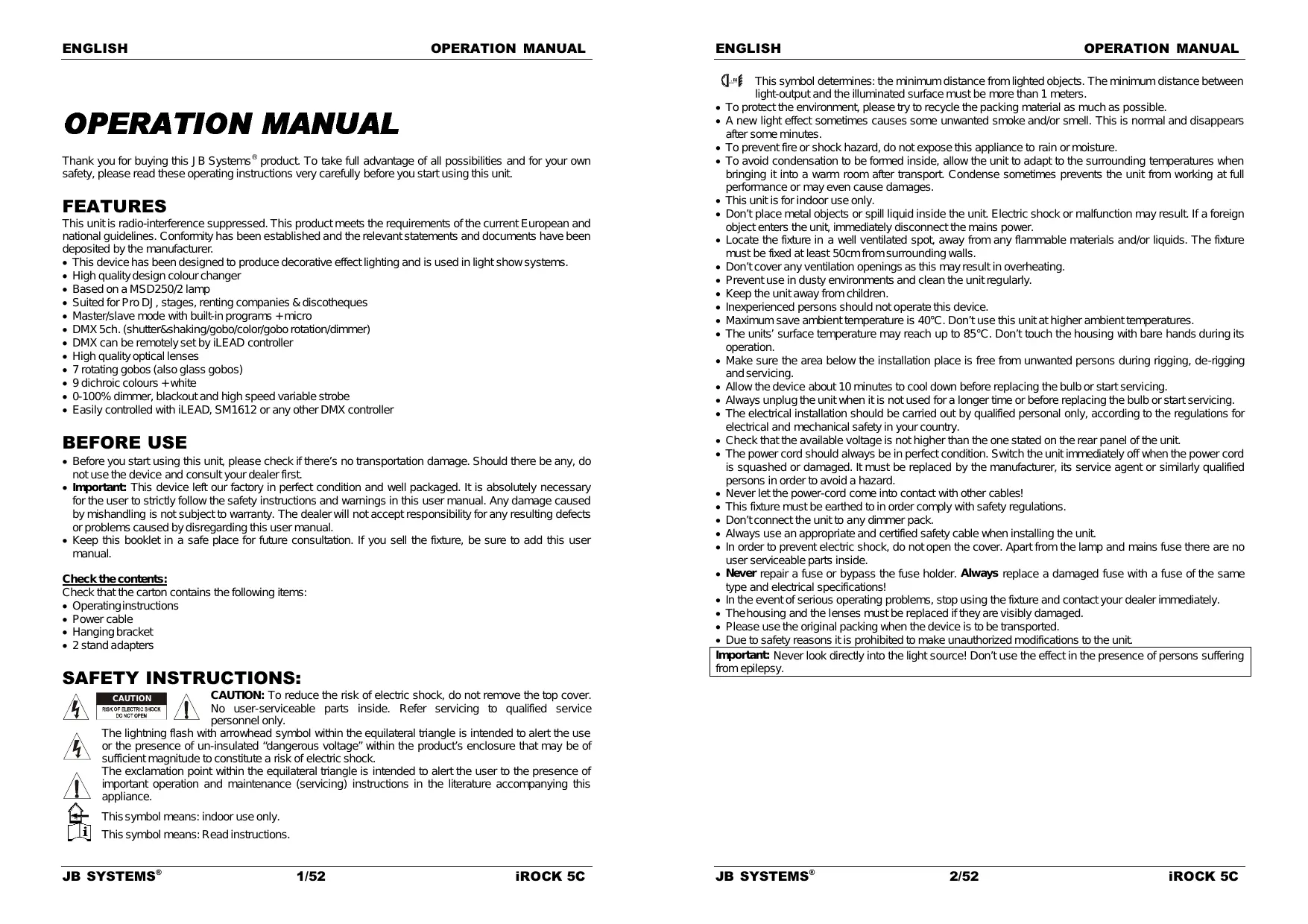 standalone or master/slave mode. JB SYSTEMS® 3/52 iROCK 5C JB SYSTEMS® 4/52 iROCK 5C ENGLISH OPERATION MANUAL