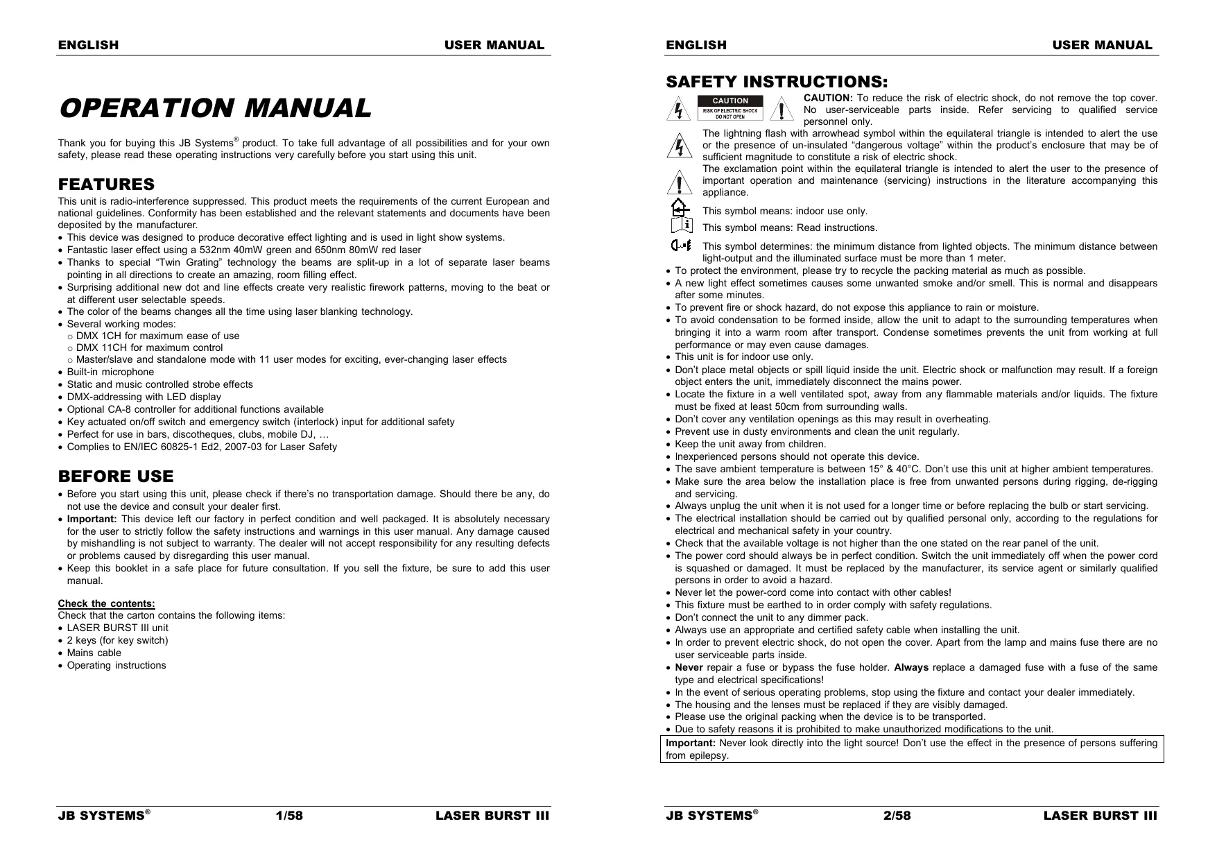 Thank you for buying this JB Systems product. To take full advantage of all possibilities and for your own safety, please read these operating instructions very carefully before you start using this unit. FEATURES This unit is radio-interference suppressed. This product meets the requirements of the current European and national guidelines. Conformity has been established and the relevant statements and documents have been deposited by the manufacturer. This device was designed to produce decorative effect lighting and is used in light show systems. Fantastic laser effect using a 532nm 40mW green and 650nm 80mW red laser Thanks to special “Twin Grating” technology the beams are split-up in a lot of separate laser beams pointing in all directions to create an amazing, room filling effect. Surprising additional new dot and line effects create very realistic firework patterns, moving to the beat or at different user selectable speeds. The color of the beams changes all the time using laser blanking technology. Several working modes: o DMX 1CH for maximum ease of use o DMX 11CH for maximum control o Master/slave and standalone mode with 11 user modes for exciting, ever-changing laser effects Built-in microphone Static and music controlled strobe effects DMX-addressing with LED display Optional CA-8 controller for additional functions available Key actuated on/off switch and emergency switch (interlock) input for additional safety Perfect for use in bars, discotheques, clubs, mobile DJ, … Complies to EN/IEC 60825-1 Ed2, 2007-03 for Laser Safety BEFORE USE Before you start using this unit, please check if there’s no transportation damage. Should there be any, do not use the device and consult your dealer first. Important: This device left our factory in perfect condition and well packaged. It is absolutely necessary for the user to strictly follow the safety instructions and warnings in this user manual. Any damage caused by mishandling is not subject to warranty. The dealer will not accept responsibility for any resulting defects or problems caused by disregarding this user manual. Keep this booklet in a safe place for future consultation. If you sell the fixture, be sure to add this user manual. Check the contents: Check that the carton contains the following items: LASER BURST III unit 2 keys (for key switch) Mains cable Operating instructions 1/58 USER MANUAL SAFETY INSTRUCTIONS: OPERATION MANUAL JB SYSTEMS® ENGLISH This symbol means: indoor use only. This symbol means: Read instructions. This symbol determines: the minimum distance from lighted objects. The minimum distance between light-output and the illuminated surface must be more than 1 meter. To protect the environment, please try to recycle the packing material as much as possible. A new light effect sometimes causes some unwanted smoke and/or smell. This is normal and disappears after some minutes. To prevent fire or shock hazard, do not expose this appliance to rain or moisture. To avoid condensation to be formed inside, allow the unit to adapt to the surrounding temperatures when bringing it into a warm room after transport. Condense sometimes prevents the unit from working at full performance or may even cause damages. This unit is for indoor use only. Don’t place metal objects or spill liquid inside the unit. Electric shock or malfunction may result. If a foreign object enters the unit, immediately disconnect the mains power. Locate the fixture in a well ventilated spot, away from any flammable materials and/or liquids. The fixture must be fixed at least 50cm from surrounding walls. Don’t cover any ventilation openings as this may result in overheating. Prevent use in dusty environments and clean the unit regularly. Keep the unit away from children. Inexperienced persons should not operate this device. The save ambient temperature is between 15° & 40°C. Don’t use this unit at higher ambient temperatures. Make sure the area below the installation place is free from unwanted persons during rigging, de-rigging and servicing. Always unplug the unit when it is not used for a longer time or before replacing the bulb or start servicing. The electrical installation should be carried out by qualified personal only, according to the regulations for electrical and mechanical safety in your country. Check that the available voltage is not higher than the one stated on the rear panel of the unit. The power cord should always be in perfect condition. Switch the unit immediately off when the power cord is squashed or damaged. It must be replaced by the manufacturer, its service agent or similarly qualified persons in order to avoid a hazard. Never let the power-cord come into contact with other cables! This fixture must be earthed to in order comply with safety regulations. Don’t connect the unit to any dimmer pack. Always use an appropriate and certified safety cable when installing the unit. In order to prevent electric shock, do not open the cover. Apart from the lamp and mains fuse there are no user serviceable parts inside. Never repair a fuse or bypass the fuse holder. Always replace a damaged fuse with a fuse of the same type and electrical specifications! In the event of serious operating problems, stop using the fixture and contact your dealer immediately. The housing and the lenses must be replaced if they are visibly damaged. Please use the original packing when the device is to be transported. Due to safety reasons it is prohibited to make unauthorized modifications to the unit. Important: Never look directly into the light source! Don’t use the effect in the presence of persons suffering from epilepsy. JB SYSTEMS® 2/58 LASER SAFETY INSTRUCTIONS: According to the EN/IEC 60825-1 Ed2, 2007-03 regulations, this laser falls under the classification 3B. Direct eye exposure can be dangerous.