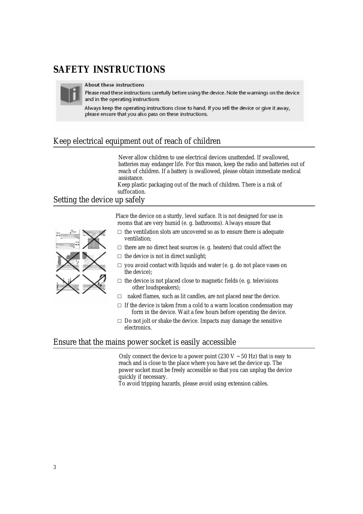 Never allow children to use electrical devices unattended. If swallowed, batteries may endanger life. For this reason, keep the radio and batteries out of reach of children. If a battery is swallowed, please obtain immediate medical assistance.