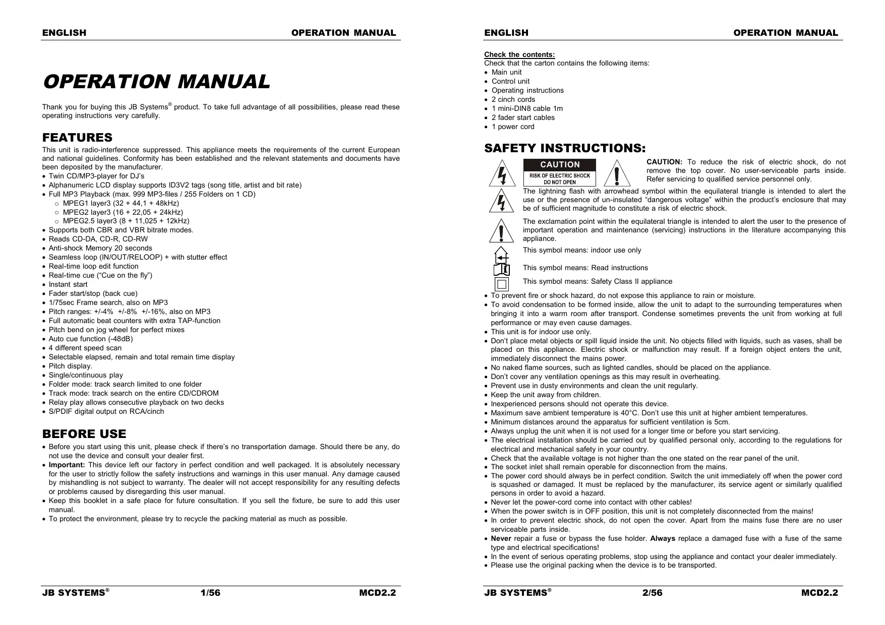 Every information is subject to change without prior notice You can download the latest version of this user manual on our website: www.beglec.com JB SYSTEMS® 9/56 MCD2.2 AC 230 V, 50Hz 26W 2.0Vrms +/-1dB @ 1kHz,0dB 20-20.000Hz (+/-1dB@0dB output) 0.01% @ 1kHz, 0dB >90dB @ 1kHz, 0dB (IHF-A weighted, w/20KHz LPF) <4sec <6sec Full automatic digital tracking. .mp3 ~ .MP3 ~ .mP3 ~ .Mp3 max. 63 character style max. 63 character style mode-1 only