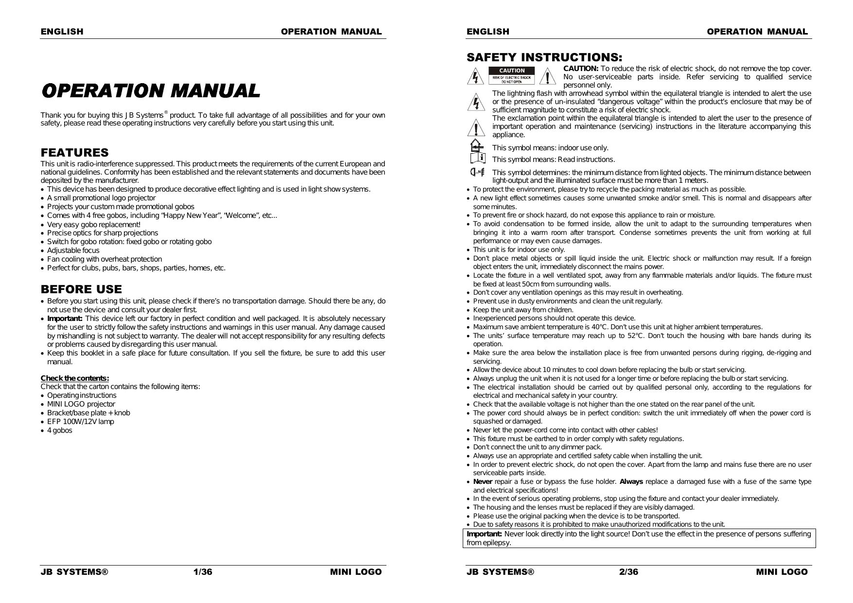 Thank you for buying this JB Systems product. To take full advantage of all possibilities and for your own safety, please read these operating instructions very carefully before you start using this unit. FEATURES This symbol means: indoor use only. This unit is radio-interference suppressed. This product meets the requirements of the current European and national guidelines. Conformity has been established and the relevant statements and documents have been deposited by the manufacturer. This device has been designed to produce decorative effect lighting and is used in light show systems. A small promotional logo projector Projects your custom made promotional gobos Comes with 4 free gobos, including “Happy New Year”, “Welcome”, etc... Very easy gobo replacement! Precise optics for sharp projections Switch for gobo rotation: fixed gobo or rotating gobo Adjustable focus Fan cooling with overheat protection Perfect for clubs, pubs, bars, shops, parties, homes, etc. BEFORE USE Before you start using this unit, please check if there’s no transportation damage. Should there be any, do not use the device and consult your dealer first. Important: This device left our factory in perfect condition and well packaged. It is absolutely necessary for the user to strictly follow the safety instructions and warnings in this user manual. Any damage caused by mishandling is not subject to warranty. The dealer will not accept responsibility for any resulting defects or problems caused by disregarding this user manual. Keep this booklet in a safe place for future consultation. If you sell the fixture, be sure to add this user manual. Check the contents: Check that the carton contains the following items: Operating instructions MINI LOGO projector Bracket/base plate + knob EFP 100W/12V lamp 4 gobos This symbol means: Read instructions. This symbol determines: the minimum distance from lighted objects. The minimum distance between light-output and the illuminated surface must be more than 1 meters. To protect the environment, please try to recycle the packing material as much as possible. A new light effect sometimes causes some unwanted smoke and/or smell. This is normal and disappears after some minutes. To prevent fire or shock hazard, do not expose this appliance to rain or moisture. To avoid condensation to be formed inside, allow the unit to adapt to the surrounding temperatures when bringing it into a warm room after transport. Condense sometimes prevents the unit from working at full performance or may even cause damages. This unit is for indoor use only. Don’t place metal objects or spill liquid inside the unit. Electric shock or malfunction may result. If a foreign object enters the unit, immediately disconnect the mains power. Locate the fixture in a well ventilated spot, away from any flammable materials and/or liquids. The fixture must be fixed at least 50cm from surrounding walls. Don’t cover any ventilation openings as this may result in overheating. Prevent use in dusty environments and clean the unit regularly. Keep the unit away from children. Inexperienced persons should not operate this device. Maximum save ambient temperature is 40°C. Don’t use this unit at higher ambient temperatures. The units’ surface temperature may reach up to 52°C. Don’t touch the housing with bare hands during its operation. Make sure the area below the installation place is free from unwanted persons during rigging, de-rigging and servicing. Allow the device about 10 minutes to cool down before replacing the bulb or start servicing. Always unplug the unit when it is not used for a longer time or before replacing the bulb or start servicing. The electrical installation should be carried out by qualified personal only, according to the regulations for electrical and mechanical safety in your country. Check that the available voltage is not higher than the one stated on the rear panel of the unit. The power cord should always be in perfect condition: switch the unit immediately off when the power cord is squashed or damaged. Never let the power-cord come into contact with other cables! This fixture must be earthed to in order comply with safety regulations. Don’t connect the unit to any dimmer pack. Always use an appropriate and certified safety cable when installing the unit. In order to prevent electric shock, do not open the cover. Apart from the lamp and mains fuse there are no user serviceable parts inside. Never repair a fuse or bypass the fuse holder. Always replace a damaged fuse with a fuse of the same type and electrical specifications! In the event of serious operating problems, stop using the fixture and contact your dealer immediately. The housing and the lenses must be replaced if they are visibly damaged. Please use the original packing when the device is to be transported. Due to safety reasons it is prohibited to make unauthorized modifications to the unit. Important: Never look directly into the light source! Don’t use the effect in the presence of persons suffering from epilepsy. JB SYSTEMS® 1/36 MINI LOGO JB SYSTEMS® 2/36 MINI LOGO ENGLISH OPERATION MANUAL DESCRIPTION: ENGLISH OPERATION MANUAL