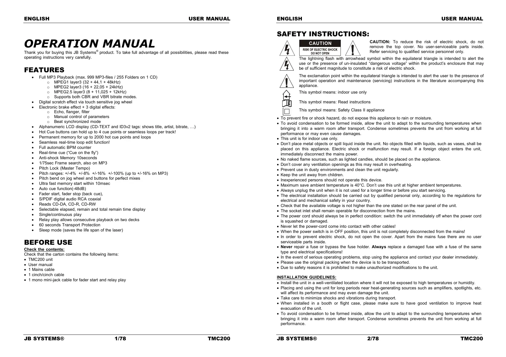 This symbol means: indoor use only This symbol means: Read instructions This symbol means: Safety Class II appliance To prevent fire or shock hazard, do not expose this appliance to rain or moisture. To avoid condensation to be formed inside, allow the unit to adapt to the surrounding temperatures when bringing it into a warm room after transport. Condense sometimes prevents the unit from working at full performance or may even cause damages. This unit is for indoor use only. Don’t place metal objects or spill liquid inside the unit. No objects filled with liquids, such as vases, shall be placed on this appliance. Electric shock or malfunction may result. If a foreign object enters the unit, immediately disconnect the mains power. No naked flame sources, such as lighted candles, should be placed on the appliance. Don’t cover any ventilation openings as this may result in overheating. Prevent use in dusty environments and clean the unit regularly. Keep the unit away from children. Inexperienced persons should not operate this device. Maximum save ambient temperature is 40°C. Don’t use this unit at higher ambient temperatures. Always unplug the unit when it is not used for a longer time or before you start servicing. The electrical installation should be carried out by qualified personal only, according to the regulations for electrical and mechanical safety in your country. Check that the available voltage is not higher than the one stated on the rear panel of the unit. The socket inlet shall remain operable for disconnection from the mains. The power cord should always be in perfect condition: switch the unit immediately off when the power cord is squashed or damaged. Never let the power-cord come into contact with other cables! When the power switch is in OFF position, this unit is not completely disconnected from the mains! In order to prevent electric shock, do not open the cover. Apart from the mains fuse there are no user serviceable parts inside. Never repair a fuse or bypass the fuse holder. Always replace a damaged fuse with a fuse of the same type and electrical specifications! In the event of serious operating problems, stop using the appliance and contact your dealer immediately. Please use the original packing when the device is to be transported. Due to safety reasons it is prohibited to make unauthorized modifications to the unit. BEFORE USE Check the contents: Check that the carton contains the following items: TMC200 unit User manual 1 Mains cable 1 cinch/cinch cable 1 mono mini-jack cable for fader start and relay play 1/78 The lightning flash with arrowhead symbol within the equilateral triangle is intended to alert the use or the presence of un-insulated “dangerous voltage” within the product’s enclosure that may be of sufficient magnitude to constitute a risk of electric shock. The exclamation point within the equilateral triangle is intended to alert the user to the presence of important operation and maintenance (servicing) instructions in the literature accompanying this appliance. Full MP3 Playback (max. 999 MP3-files / 255 Folders on 1 CD) o MPEG1 layer3 (32 + 44,1 + 48kHz) o MPEG2 layer3 (16 + 22,05 + 24kHz) o MPEG2.5 layer3 (8 + 11,025 + 12kHz) o Supports both CBR and VBR bitrate modes. Digital scratch effect via touch sensitive jog wheel Electronic brake effect + 3 digital effects: o Echo, flanger, filter o Manual control of parameters o Beat synchronized mode Alphanumeric LCD display (CD-TEXT and ID3v2 tags: shows title, artist, bitrate, …) Hot Cue buttons can hold up to 4 cue points or seamless loops per track! Permanent memory for up to 2000 hot cue points and loops Seamless real-time loop edit function! Full automatic BPM counter Real-time cue (“Cue on the fly”) Anti-shock Memory 10seconds 1/75sec Frame search, also on MP3 Pitch Lock (Master Tempo) Pitch ranges: +/-4% +/-8% +/-16% +/-100% (up to +/-16% on MP3) Pitch bend on jog wheel and buttons for perfect mixes Ultra fast memory start within 10msec Auto cue function(-48dB) Fader start, fader stop (back cue), S/PDIF digital audio RCA coaxial Reads CD-DA, CD-R, CD-RW Selectable elapsed, remain and total remain time display Single/continuous play Relay play allows consecutive playback on two decks 60 seconds Transport Protection Sleep mode (saves the life span of the laser) JB SYSTEMS® CAUTION: To reduce the risk of electric shock, do not remove the top cover. No user-serviceable parts inside. Refer servicing to qualified service personnel only. INSTALLATION GUIDELINES: Install the unit in a well-ventilated location where it will not be exposed to high temperatures or humidity. Placing and using the unit for long periods near heat-generating sources such as amplifiers, spotlights, etc. will affect its performance and may even damage the unit. Take care to minimize shocks and vibrations during transport. When installed in a booth or flight case, please make sure to have good ventilation to improve heat evacuation of the unit. To avoid condensation to be formed inside, allow the unit to adapt to the surrounding temperatures when bringing it into a warm room after transport. Condense sometimes prevents the unit from working at full performance. TMC200 JB SYSTEMS® 2/78 TMC200 ENGLISH USER MANUAL CLEANING THE CD-PLAYER: Clean by wiping with a polished cloth slightly dipped with water. Avoid getting water inside the unit. Do not use volatile liquids such as benzene or thinner which will damage the unit. CONNECTIONS Use the supplied cinch cable to connect the audio output of the CD player with a CD input on your mixing unit. Also connect the fader start cable if your audio mixer has fader start connections. (Synq® or Pioneer® compatible) Connect the mains cable.