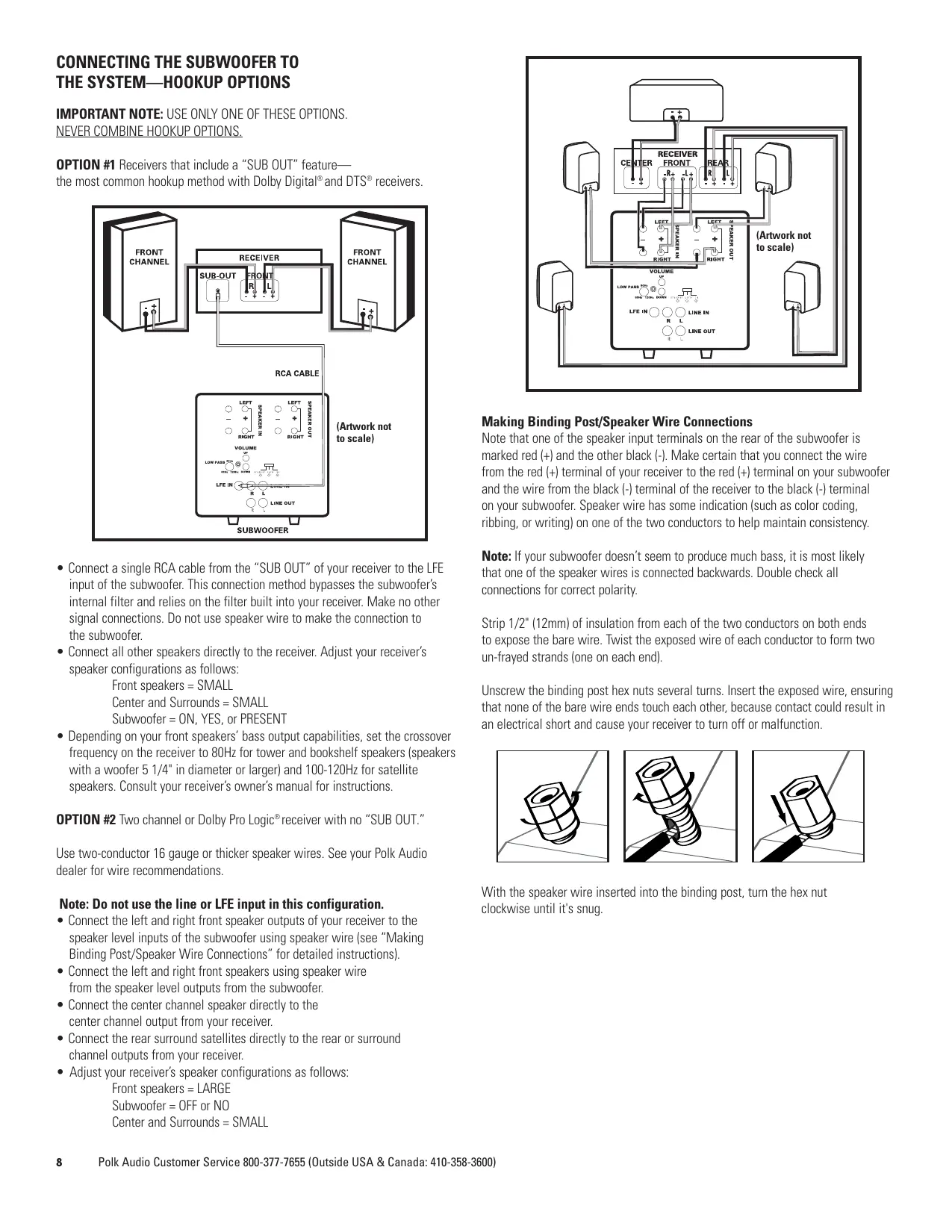 If, after following these hook up directions, you experience difficulty, please double-check all wire connections. Should you isolate the problem to the subwoofer, contact the authorized Polk Audio dealer where you made your purchase, or call Polk Audio's friendly Customer Service Department at 1-800-377-7655 (calls from US or CAN only), 410-358-3600 9am to 6pm EST, Monday through Friday.