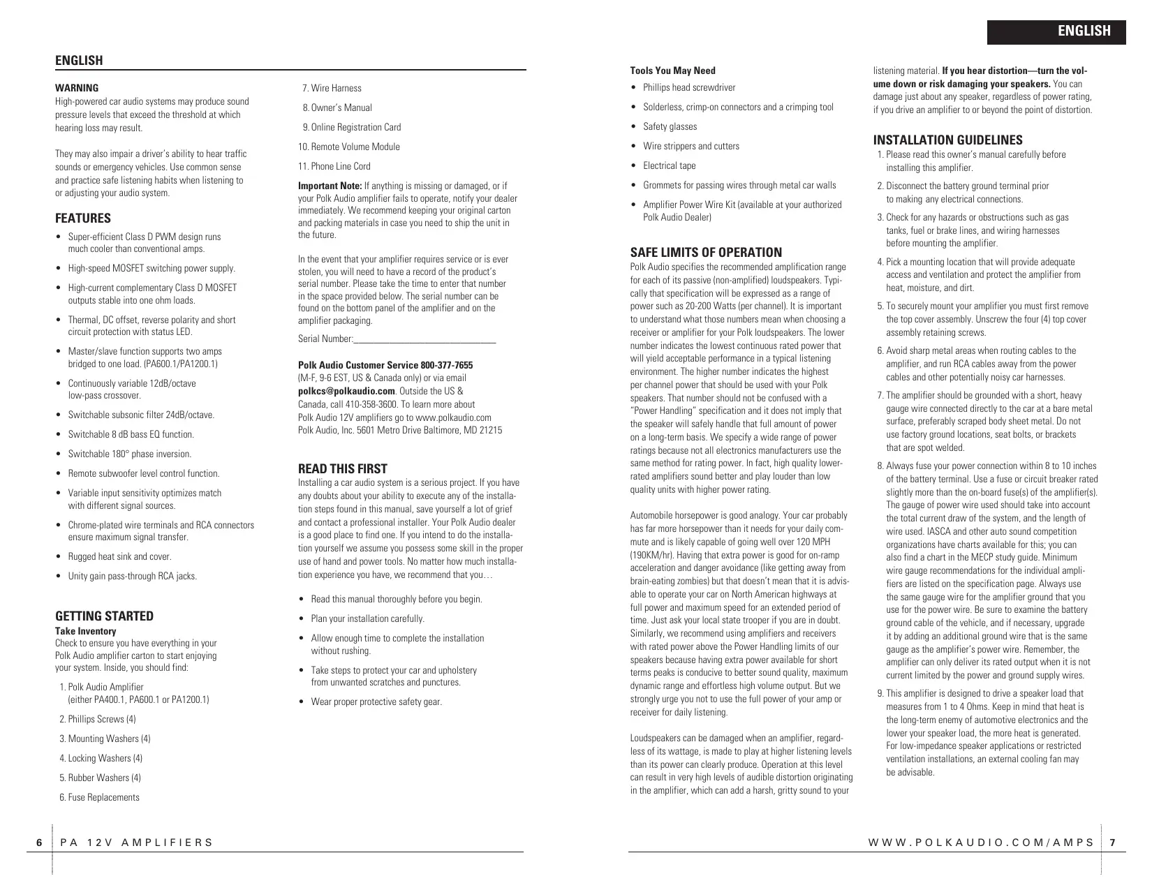 - Grommets for passing wires through metal car walls In the event that your amplifier requires service or is ever stolen, you will need to have a record of the product’s serial number. Please take the time to enter that number in the space provided below. The serial number can be found on the bottom panel of the amplifier and on the amplifier packaging. Serial Number:____________________________ Polk Audio Customer Service 800-377-7655 (M-F, 9-6 EST, US & Canada only) or via email polkcs@polkaudio.com. Outside the US & Canada, call 410-358-3600. To learn more about Polk Audio 12V amplifiers go to www.polkaudio.com Polk Audio, Inc. 5601 Metro Drive Baltimore, MD 21215