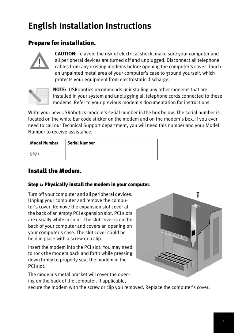Desenchufe todos los cables telefónicos de los módems actuales antes de abrir la tapa de la CPU. Toque la superficie metálica de la carcasa de su ordenador que esté sin pintar para descargar la electricidad estática. NOTA: USRobotics recomienda desinstalar cualquier otro módem que esté instalado en su sistema y desenchufar los cables telefónicos conectados a éstos. Si desea obtener más información, consulte la documentación adjunta al módem. Escriba el número de serie de su nuevo módem USRobotics en el recuadro que encontrará a continuación. Está situado en la caja y en la pegatina blanca del código de barras del módem. Si alguna vez tiene que llamar a nuestro departamento de asistencia técnica, necesitará este número y el de modelo para recibir asistencia. Número de modelo