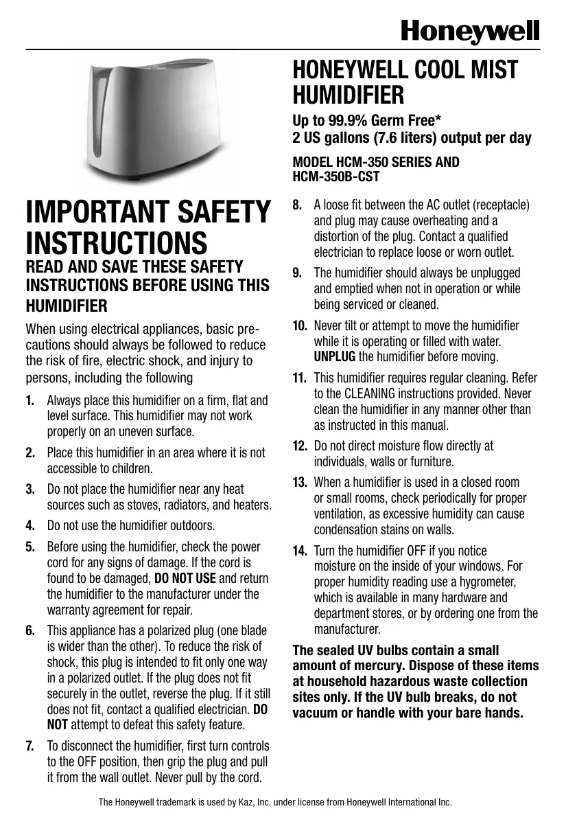 moisture on the inside of your windows. For proper humidity reading use a hygrometer, which is available in many hardware and department stores, or by ordering one from the manufacturer. The sealed UV bulbs contain a small amount of mercury. Dispose of these items at household hazardous waste collection sites only. If the UV bulb breaks, do not vacuum or handle with your bare hands. The Honeywell trademark is used by Kaz, Inc. under license from Honeywell International Inc. INTRODUCTION HOW DOES IT WORK? GERM FREE COOL MIST SYSTEM Once the filled water tank is in place, water is delivered to the UV and wicking systems. When the unit is on, the water moves very slowly past the UV system. This is ample time to destroy germs, fungus and mold that may be present in the water. The water is then delivered to the filter/wick. This saturated wick not only filters the air, but also provides moisture to the humidifier fan, which in turn, delivers germ free* moisture to the room. Your humidifier is made up of these parts: Motor Housing/ Upper Enclosure Water Tank Fill Cap Outside O-Ring Gasket Inside Filter Base