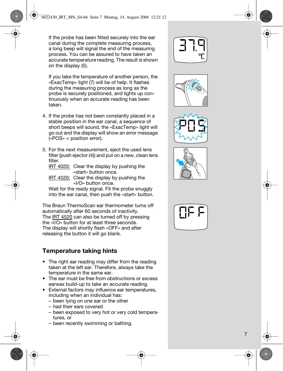 For the next measurement, eject the used lens filter (push ejector (4)) and put on a new, clean lens filter. IRT 4020: Clear the display by pushing the «start» button once. IRT 4520: Clear the display by pushing the | </O» button once. & Wait for the ready signal. Fit the probe snuggly ia into the ear canal, then push the «start» button. La\ —8— The Braun ThermoScan ear thermometer tums off TE automatically after 60 seconds of inactivity. nm Ê Ê The IRT 4520 can also be tumed off by pressing Li the «/0» button for at least three seconds. The display will shortly flash «OFF» and after LL releasing the button it will go blank. Temperature taking hints + _ The right ear reading may differ from the reading taken at the left ear. Therefore, always take the temperature in the same ear. +_ The ear must be free from obstructions or excess earwax build-up to take an accurate reading. External factors may influence ear temperatures, including when an individual has: — been Iying on one ear or the other — had their ears covered — been exposed to very hot or very cold tempera- tures, or | — been recently swimming or bathing.