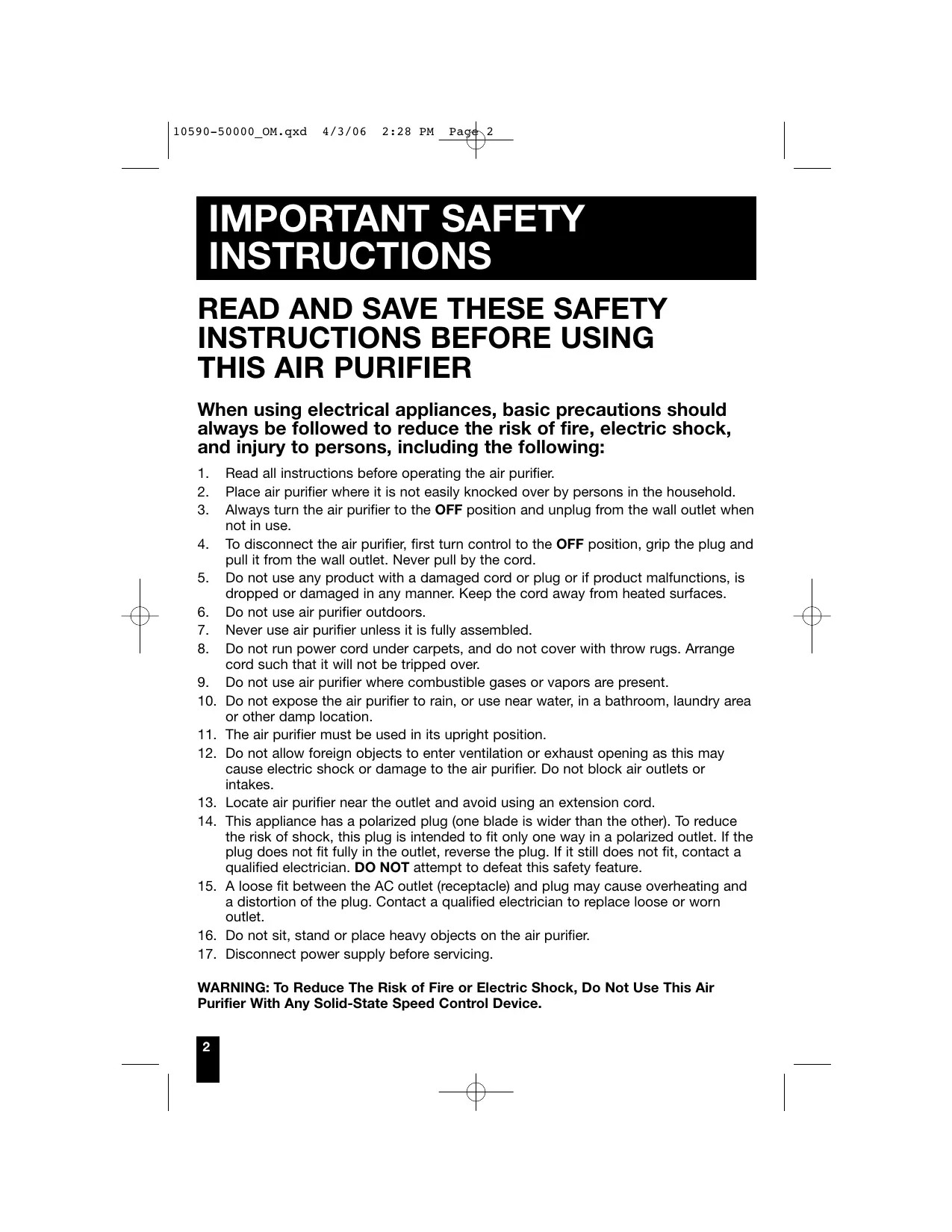A FILTER HEP Owner’s Guide For LifeTime HEPA™ Permanent Filter Model Series 10590 • 50100 • 50150 • 50200 • 50250 • 50300 Air Purifiers The Science of Clean Air® 10590-50000_OM.qxd 4/3/06 2:28 PM Page 2 IMPORTANT SAFETY INSTRUCTIONS