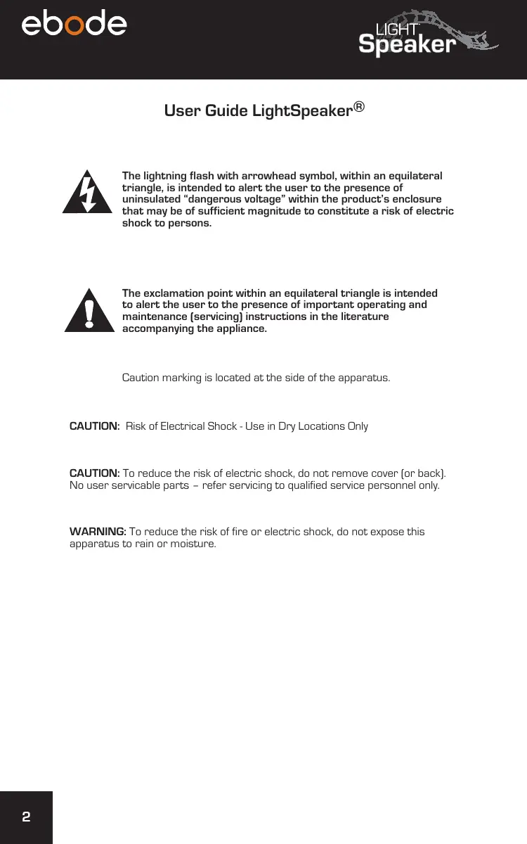 Thank you for choosing a LightSpeaker® from ebode electronics. You have chosen one of the most unique, patented, audio systems in the world. With proper installation and operation, you will enjoy years of trouble-free use. ebode electronics sells numerous products for use inside or outside your home. To see the complete ebode electronics product assortment, visit us on the internet at: www.ebodeelectronics.eu.