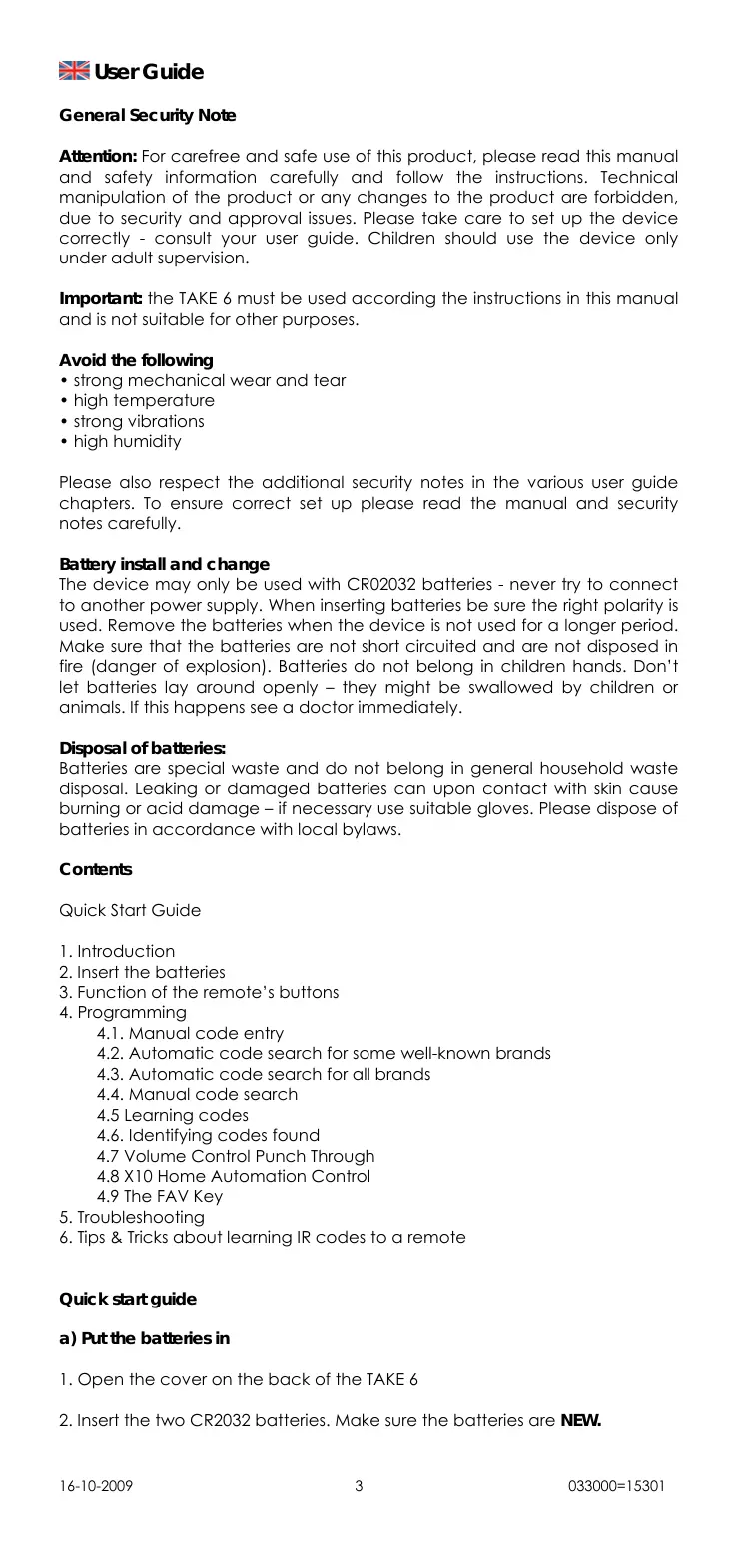 The device may only be used with CR02032 batteries - never try to connect to another power supply. When inserting batteries be sure the right polarity is used. Remove the batteries when the device is not used for a longer period. Make sure that the batteries are not short circuited and are not disposed in fire (danger of explosion). Batteries do not belong in children hands. Don't let batteries lay around openly - they might be swallowed by children or animals. If this happens see a doctor immediately.