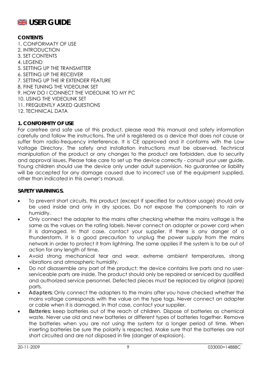 For carefree and safe use of this product, please read this manual and safety information carefully and follow the instructions. The unit is registered as a device that does not cause or suffer from radio-frequency interference. It is CE approved and it conforms with the Low Voltage Directory. The safety and installation instructions must be observed. Technical manipulation of the product or any changes to the product are forbidden, due to security and approval issues. Please take care to set up the device correctly - consult your user guide. Young children should use the device only under adult supervision. No guarantee or liability will be accepted for any damage caused due to incorrect use of the equipment supplied, other than indicated in this owner's manual.