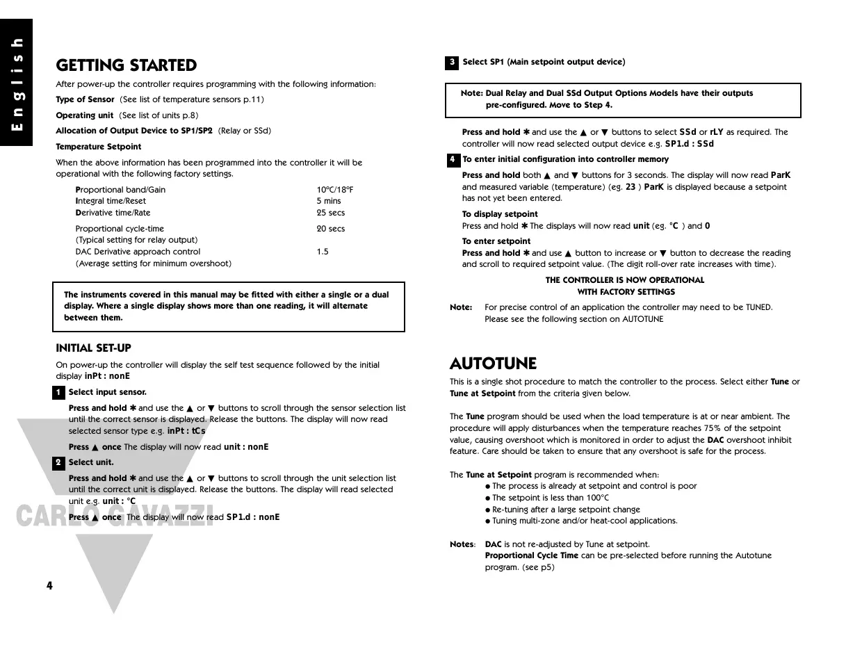 E n g l i s h 3 Select SP1 (Main setpoint output device) GETTING STARTED After power-up the controller requires programming with the following information: Note: Dual Relay and Dual SSd Output Options Models have their outputs pre-configured. Move to Step 4. Type of Sensor (See list of temperature sensors p.11) Operating unit (See list of units p.8) Allocation of Output Device to SP1/SP2 (Relay or SSd) Press and hold ✱ and use the ▲ or ▼ buttons to select SSd or rLY as required. The controller will now read selected output device e.g. SP1.d : SSd Temperature Setpoint When the above information has been programmed into the controller it will be operational with the following factory settings. Proportional band/Gain Integral time/Reset Derivative time/Rate 10ºC/18ºF 5 mins 25 secs Proportional cycle-time (Typical setting for relay output) DAC Derivative approach control (Average setting for minimum overshoot) 20 secs