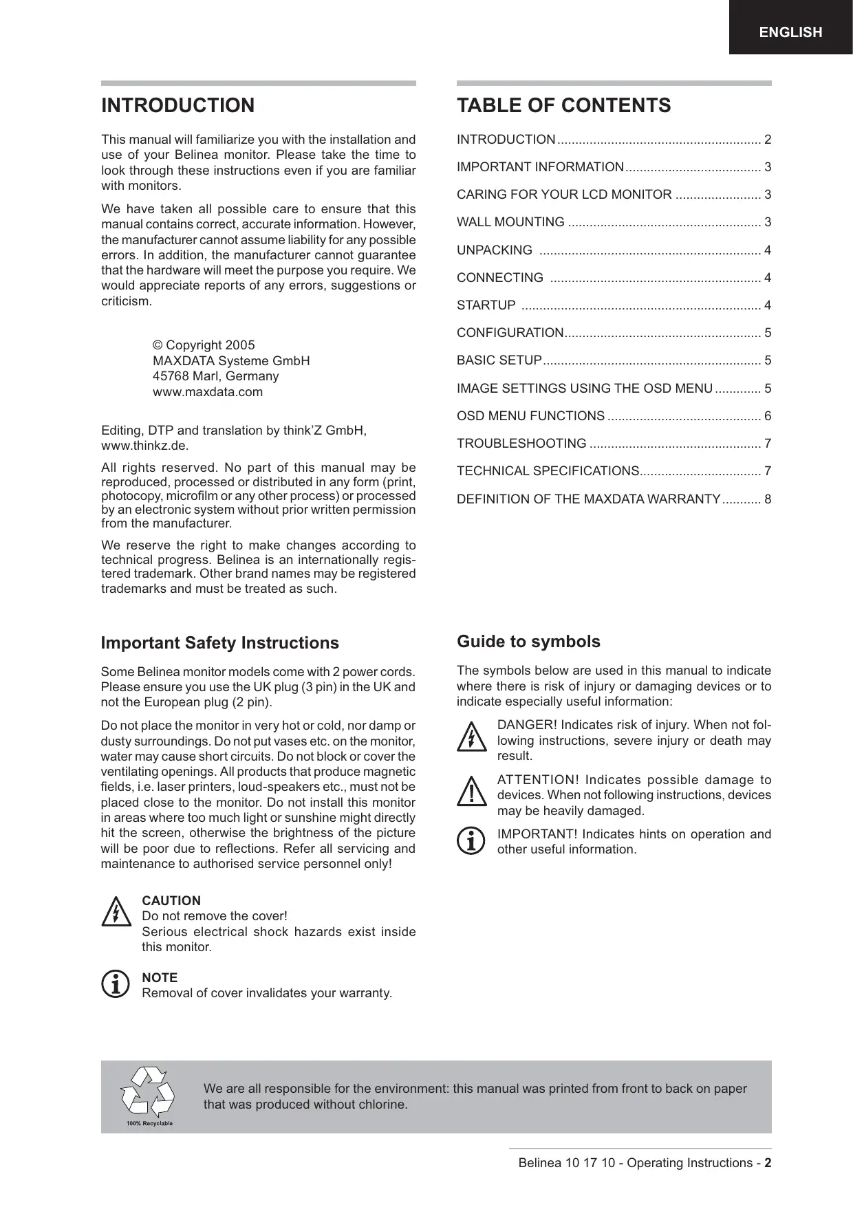 This manual will familiarize you with the installation and use of your Belinea monitor. Please take the time to look through these instructions even if you are familiar with monitors.