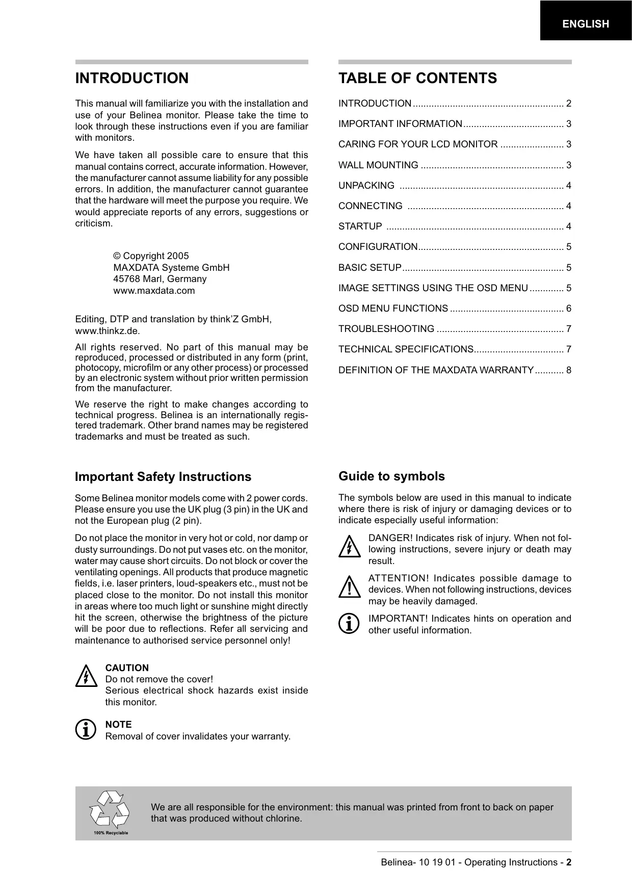 We are all responsible for the environment: this manual was printed from front to back on paper that was produced without chlorine.