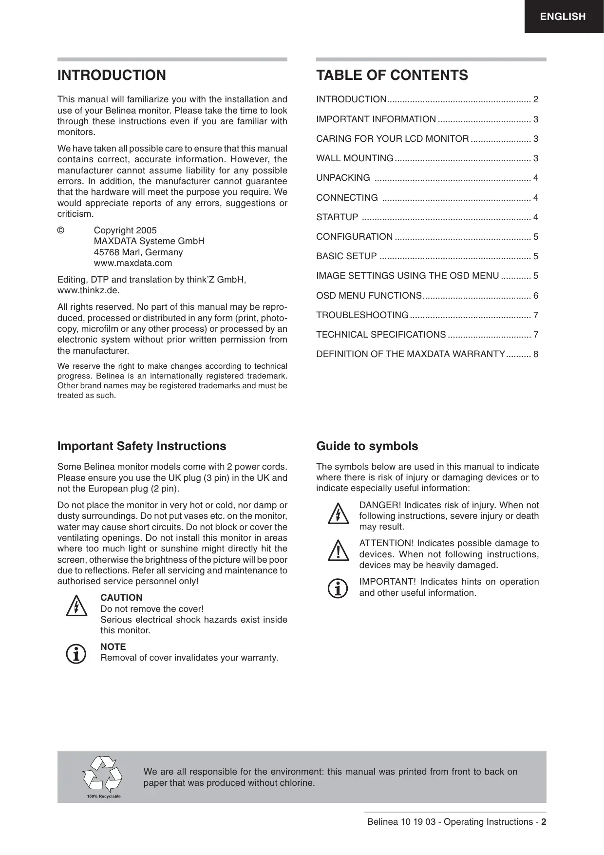 This manual will familiarize you with the installation and use of your Belinea monitor. Please take the time to look through these instructions even if you are familiar with monitors.