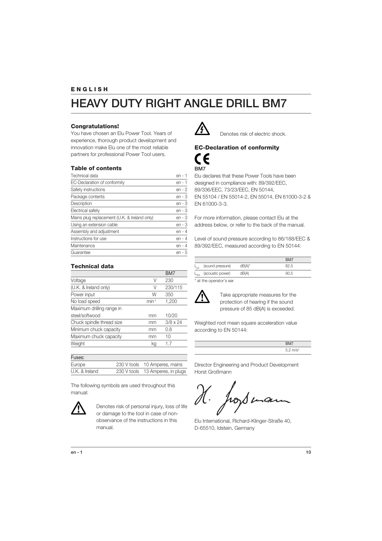 Caractéristiques techniques Déclaration CE de conformité Instructions de sécurité Contenu de l’emballage Description Sécurité électrique Câbles de rallonge Assemblage et réglage Mode d’emploi Entretien Garantie EN 55014, EN 61000-3-2 & EN 61000-3-3. Pour de plus amples informations, contacter Elu à l’adresse ci-dessous ou se reporter au dos de ce manuel. Niveau de pression acoustique suivant 86/188/CEE & 89/392/CEE, mesuré suivant EN 50144: BM7 LpA Capacité minimum du mandrin Capacité maximum du mandrin Poids