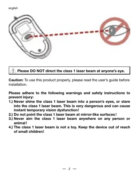 3.) Never aim the class 1 laser beam anywhere on any person or animal!