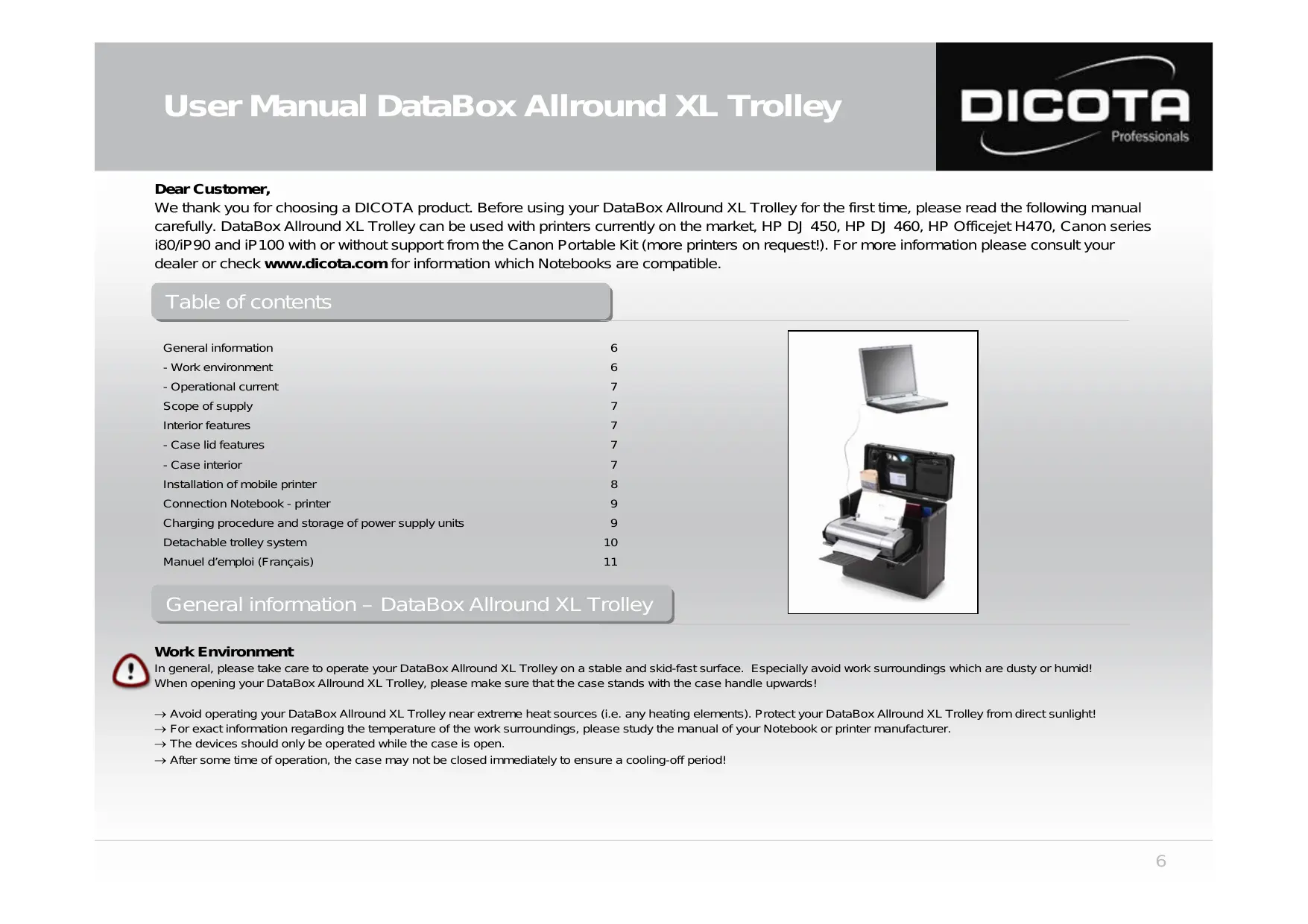 We thank you for choosing a DICOTA product. Before using your DataBox Allround XL Trolley for the first time, please read the following manual carefully. DataBox Allround XL Trolley can be used with printers currently on the market, HP DJ 450, HP DJ 460, HP Officejet H470, Canon series i80/iP90 and iP100 with or without support from the Canon Portable Kit (more printers on request!). For more information please consult your dealer or check www.dicota.com for information which Notebooks are compatible.