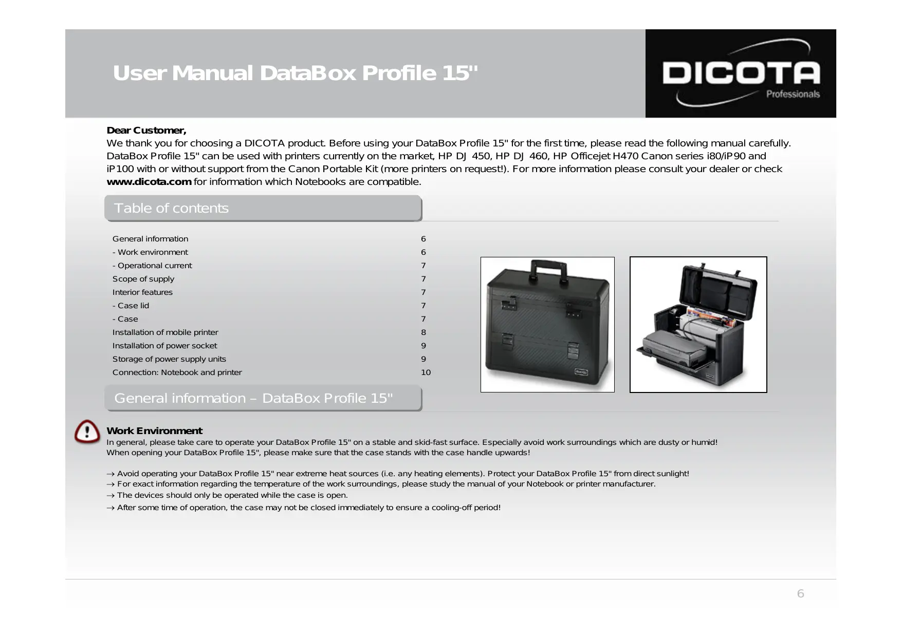 We thank you for choosing a DICOTA product. Before using your DataBox Profile 15" for the first time, please read the following manual carefully. DataBox Profile 15" can be used with printers currently on the market, HP DJ 450, HP DJ 460, HP Officejet H470 Canon series i80/iP90 and iP100 with or without support from the Canon Portable Kit (more printers on request!). For more information please consult your dealer or check www.dicota.com for information which Notebooks are compatible.