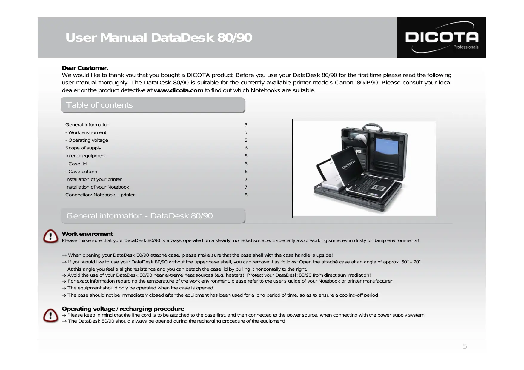 We would like to thank you that you bought a DICOTA product. Before you use your DataDesk 80/90 for the first time please read the following user manual thoroughly. The DataDesk 80/90 is suitable for the currently available printer models Canon i80/iP90. Please consult your local dealer or the product detective at www.dicota.com to find out which Notebooks are suitable.