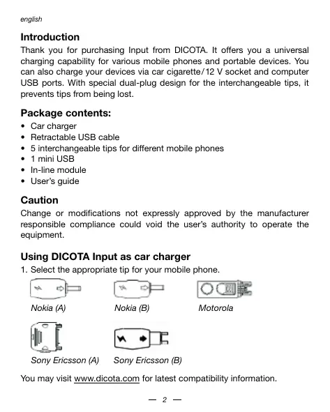 Thank you for purchasing Input from DICOTA. It offers you a universal charging capability for various mobile phones and portable devices. You can also charge your devices via car cigarette/12 V socket and computer USB ports. With special dual-plug design for the interchangeable tips, it prevents tips from being lost.